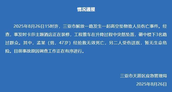 據三亞市天涯區應急管理局通報,8月26日15時許,三亞市解放一路發生一起高空墜物致人員傷亡事件。經查,事發時卡莎主題酒店正在裝修,工程推車在升降過程中突然墜落,砸中樓下3名路過群眾。其中,孟某(男,47歲)經搶救無效死亡,另二人受傷送醫,暫無生命危險。目前事故原因調查工作正在有序進行。