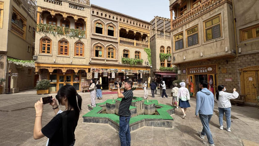午后時光,陽光灑落在新疆和田市團城的巷道里。極具民族特色的“阿依旺”式建筑鱗次櫛比。街道兩旁,游客三五成群,或在特色餐館品嘗美食,或在非遺作坊體驗手工藝,或在旅拍店前留下身影。人聲鼎沸的熱鬧景象,見證著這片土地的蝶變與新生。