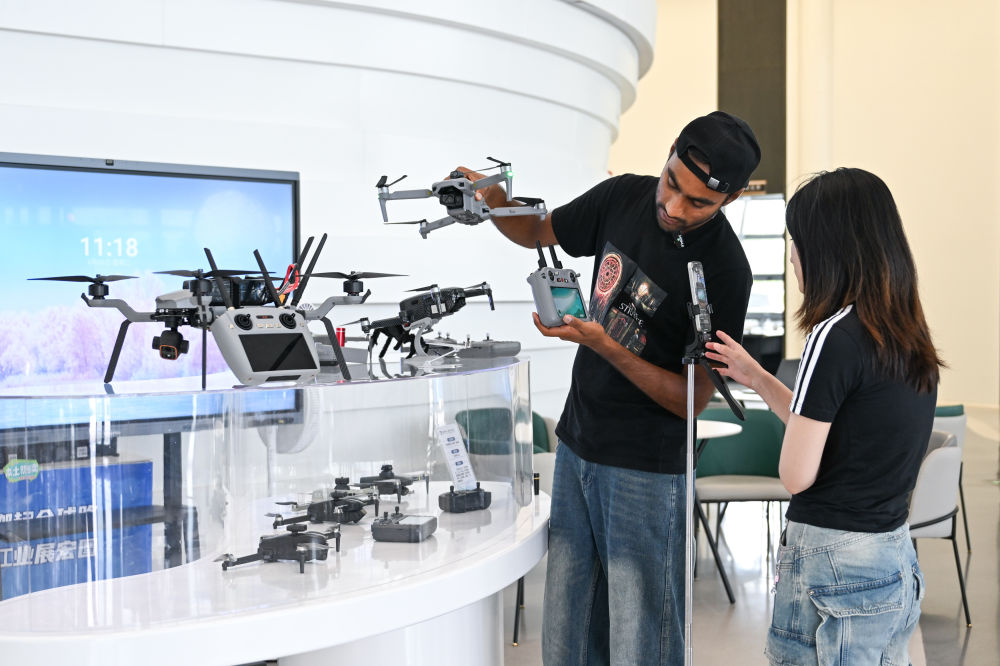 8月26日,在湖北省鄂州市跨境電商產(chǎn)業(yè)園,主播在直播售賣無人機相關(guān)產(chǎn)品。記者杜子璇 攝