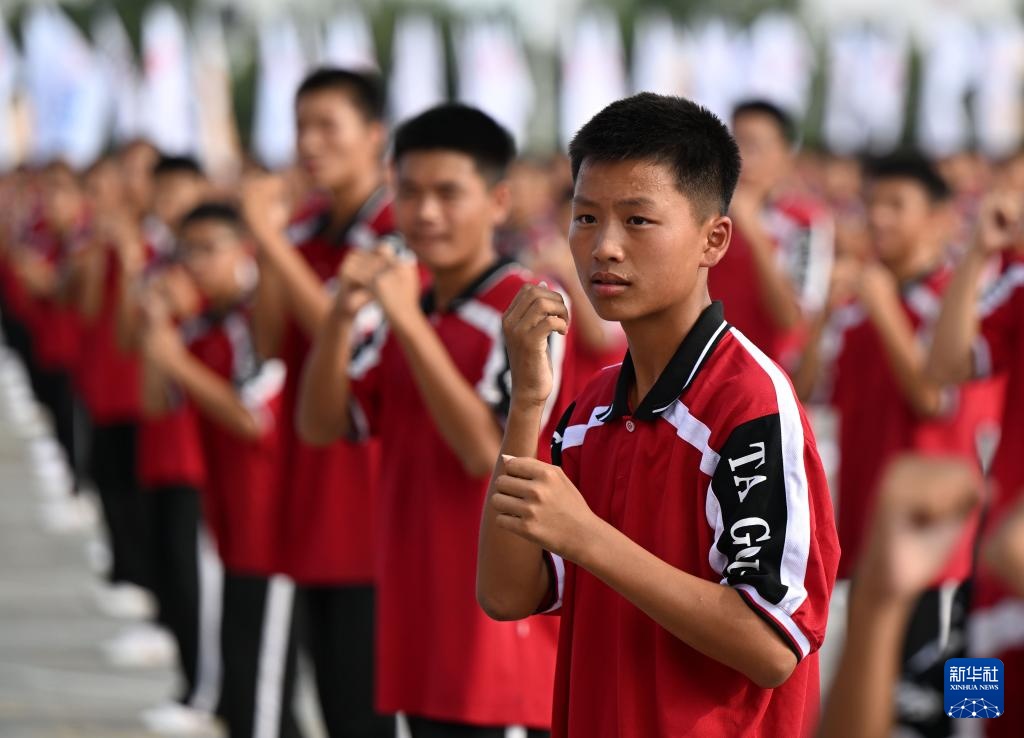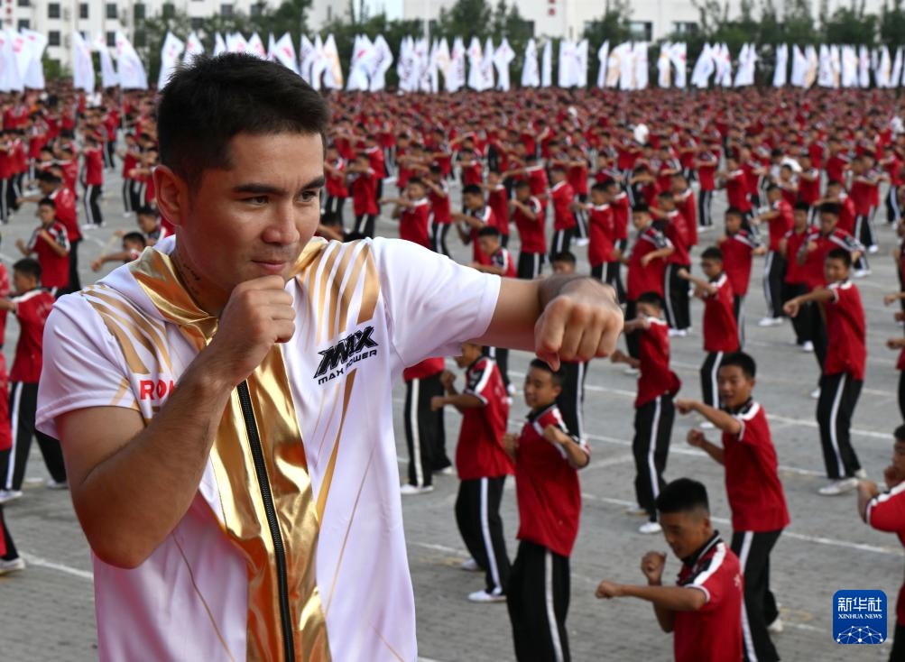 8月27日,中國拳擊運動員哈斯(前)在快閃活動中帶領少林塔溝武術學校的學生練習拳擊。新華社記者 李嘉南 攝