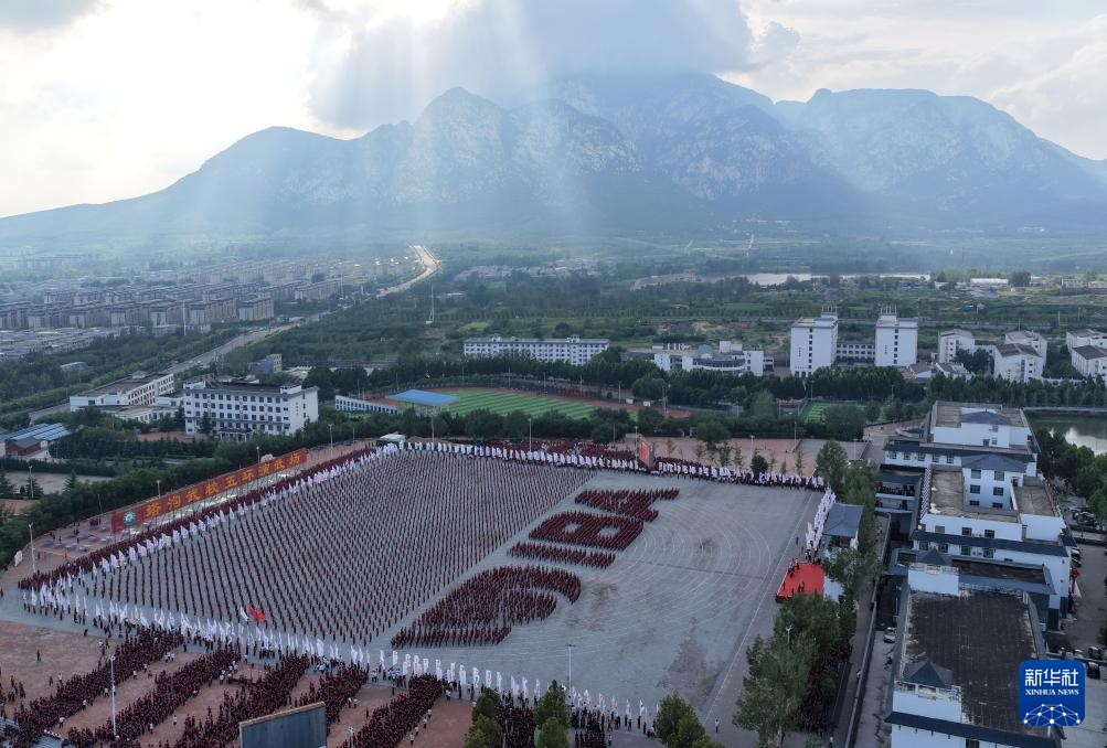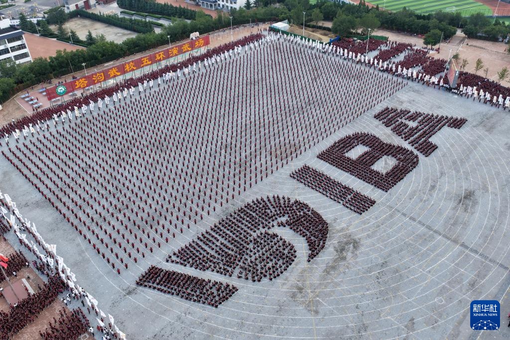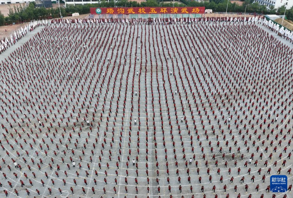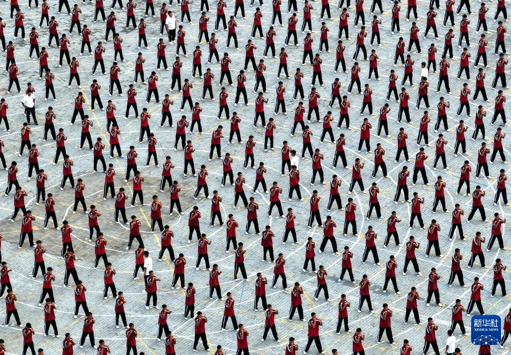 8月27日,少林塔溝武術學校學生在快閃活動中(無人機照片)。新華社記者 李嘉南 攝