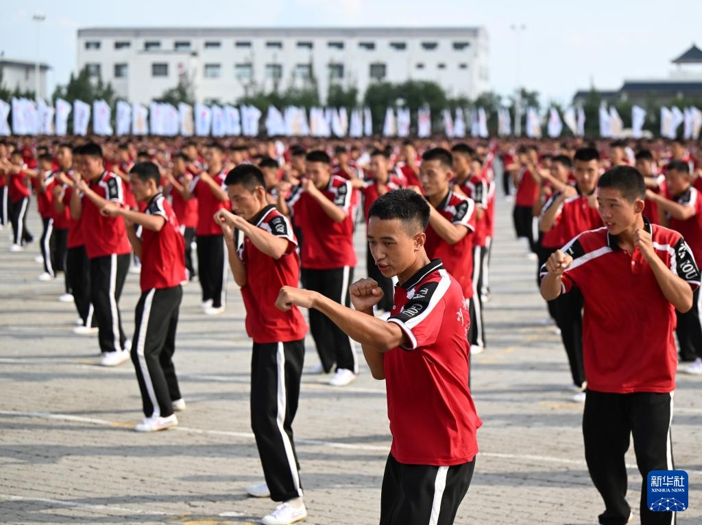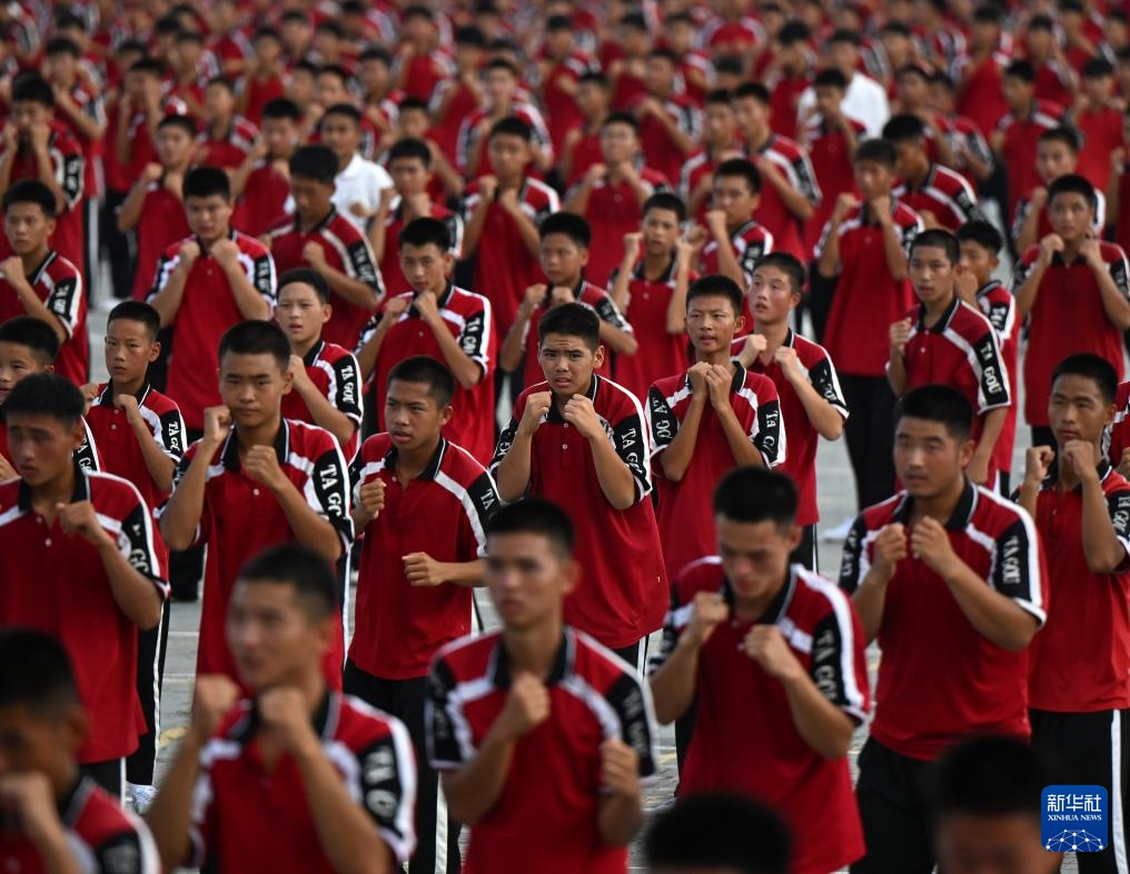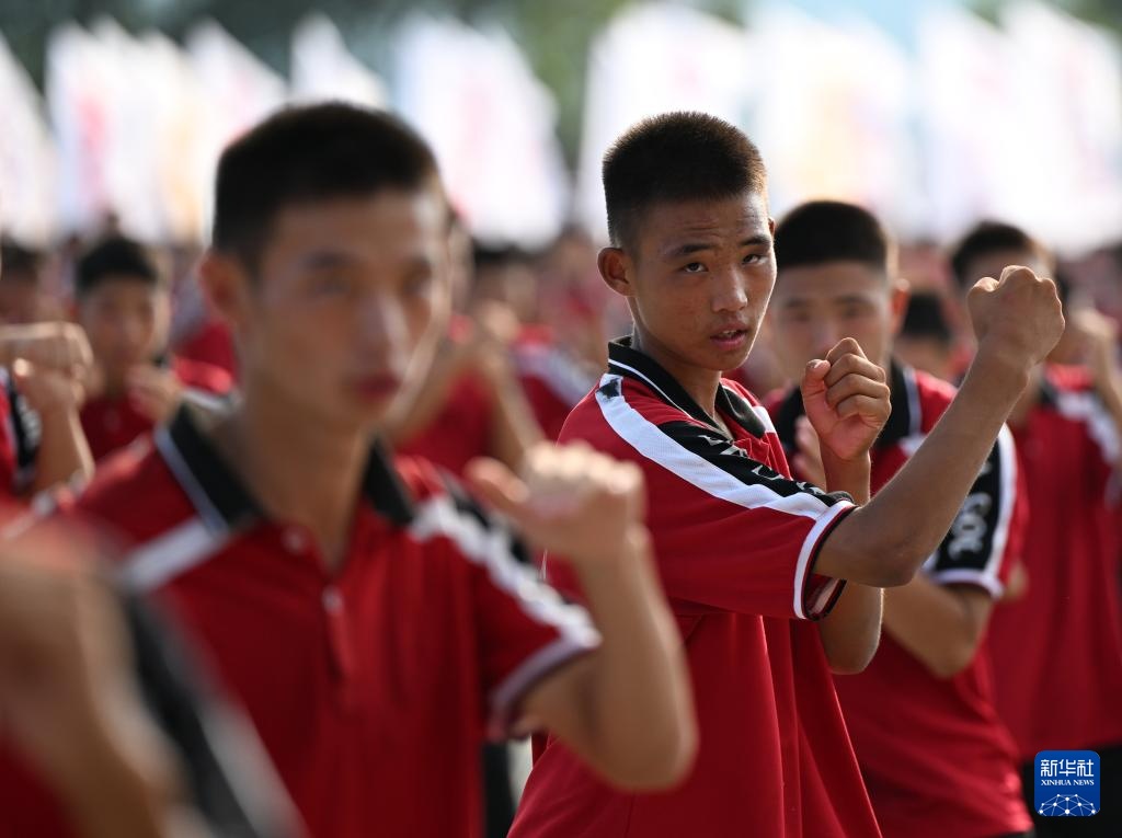 8月27日,少林塔溝武術學校學生在快閃活動中練習拳擊。新華社記者 李嘉南 攝