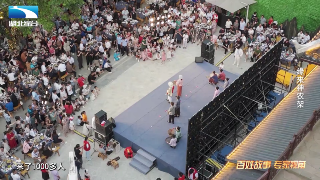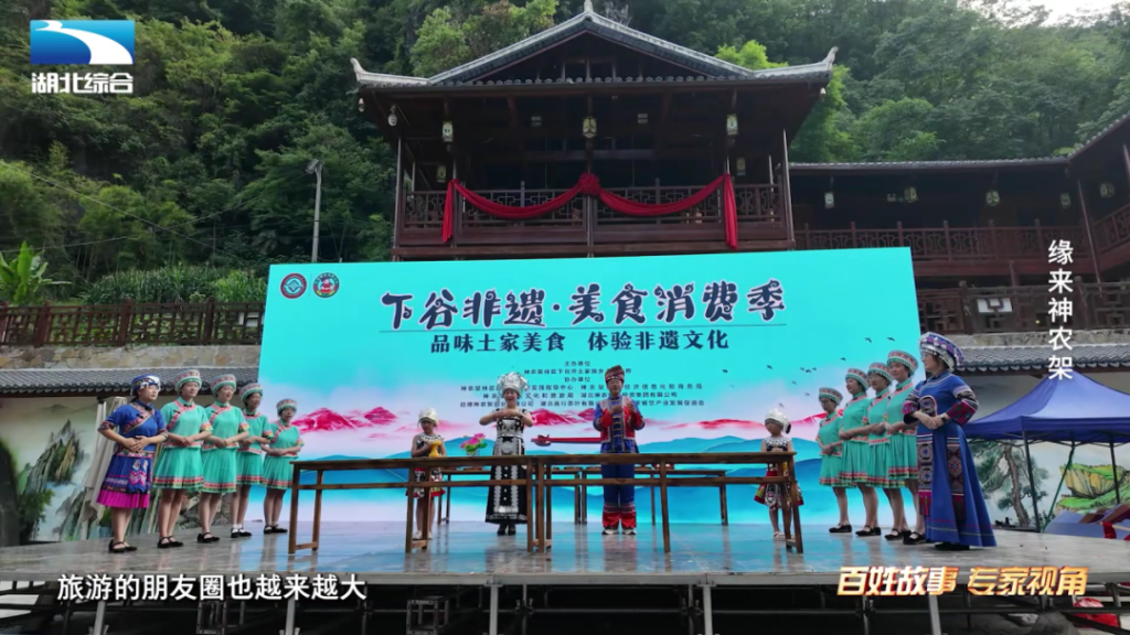 在神農(nóng)架下谷坪土家族鄉(xiāng)非遺美食消費季現(xiàn)場,1000多位游客相聚于此,感受當?shù)貍鹘y(tǒng)非遺的魅力。下谷坪土家族鄉(xiāng)是離神農(nóng)架中心地區(qū)最偏遠的一個鄉(xiāng),常住人口只有4000多人,可這里竟然有唐戲、皮影戲、薅草鑼鼓、土家八大碗等4個省級非遺。此次活動全程由當?shù)鼐用褡跃幾詫ё匝荩瑢⑽幕c美食、表演深度融合,活動現(xiàn)場唐戲《樓臺會》表演時,幺妹同步端出“唐戲燜大肉”這道硬菜,成為全場亮點。