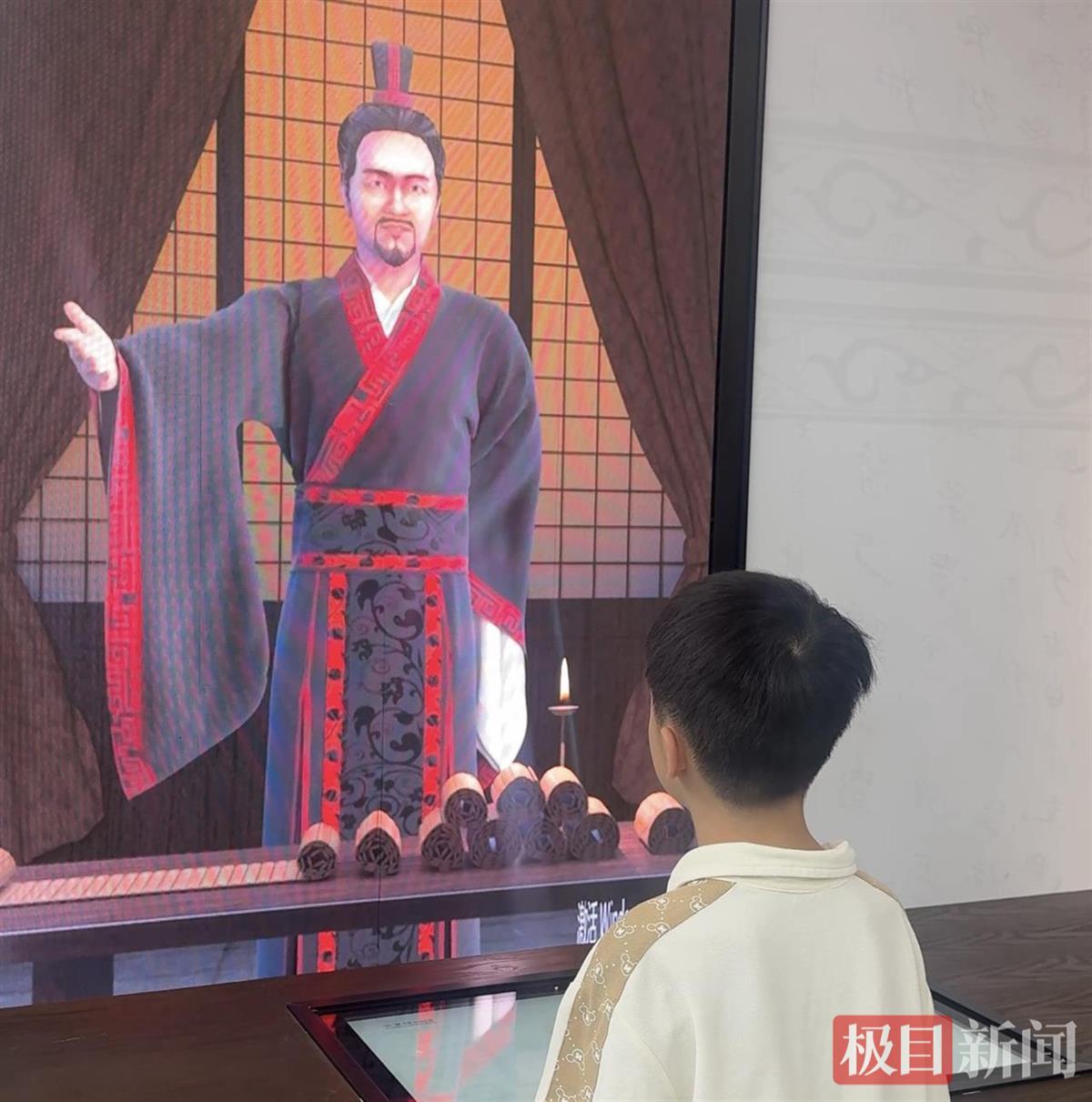 參觀不久,一面AR魔鏡吸引了我的注意,一名小男孩正對著屏幕里的秦吏“喜”臨摹簡牘,指尖劃過虛擬竹簡時,兩千年前的法律條文竟成了可觸碰的游戲。