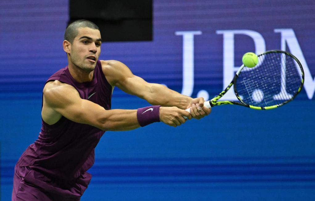 8月27日,阿爾卡拉斯在比賽中回球。新華社記者 李睿 攝
