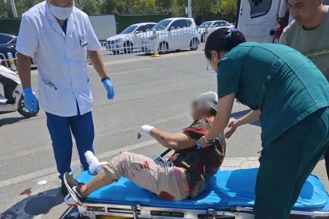 經(jīng)初步觀察,老人左手、右腳及頭部傷勢(shì)較重,且肇事車輛已逃逸,現(xiàn)場(chǎng)情況十分緊急。考慮到隨意挪動(dòng)可能加重老人傷情,同時(shí)又擔(dān)憂烈日暴曬引發(fā)二次風(fēng)險(xiǎn),金松第一時(shí)間撥打120急救電話與交警部門電話,隨后從車內(nèi)取出雨傘,蹲在老人身旁全程為其遮擋烈日。在安撫老人情緒的同時(shí),他耐心詢問(wèn)老人子女的聯(lián)系方式,幸運(yùn)的是,盡管老人傷勢(shì)嚴(yán)重,但仍記得女兒的電話。金松立即撥通電話,將事故情況與老人傷勢(shì)詳細(xì)告知其女兒,讓家屬及時(shí)掌握信息。