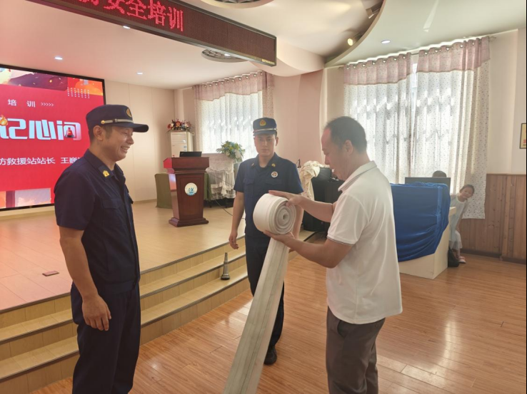 理論學習結束后,消防隊員還將訓練器材搬到現場,開展消防水帶實操教學。他們規范演示了水帶展開、收卷及接口與槍頭的快速連接技巧,并邀請教職工分組體驗,從“看操作”到“親上手”,幫助大家熟練掌握操作要領。