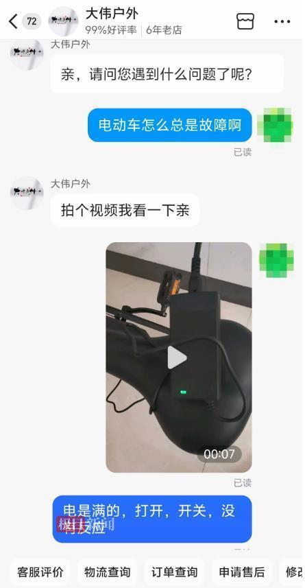 最后,在記者協(xié)調(diào)下,客服給出了解決方案:“明先生先墊付運(yùn)費(fèi)將電動(dòng)車寄過來,我們收到貨后返還運(yùn)費(fèi),之后由我們對(duì)接廠家維修,維修完成后再寄回給明先生。”記者第一時(shí)間將店鋪的解決方案告知明先生,明先生隨即聯(lián)系“大偉戶外”客服確認(rèn),在得到肯定的答復(fù)后,懸了近半年的心終于放下。“非常感謝你們!如果沒有極目新聞的幫助,這個(gè)事還不知道要拖到什么時(shí)候。”
