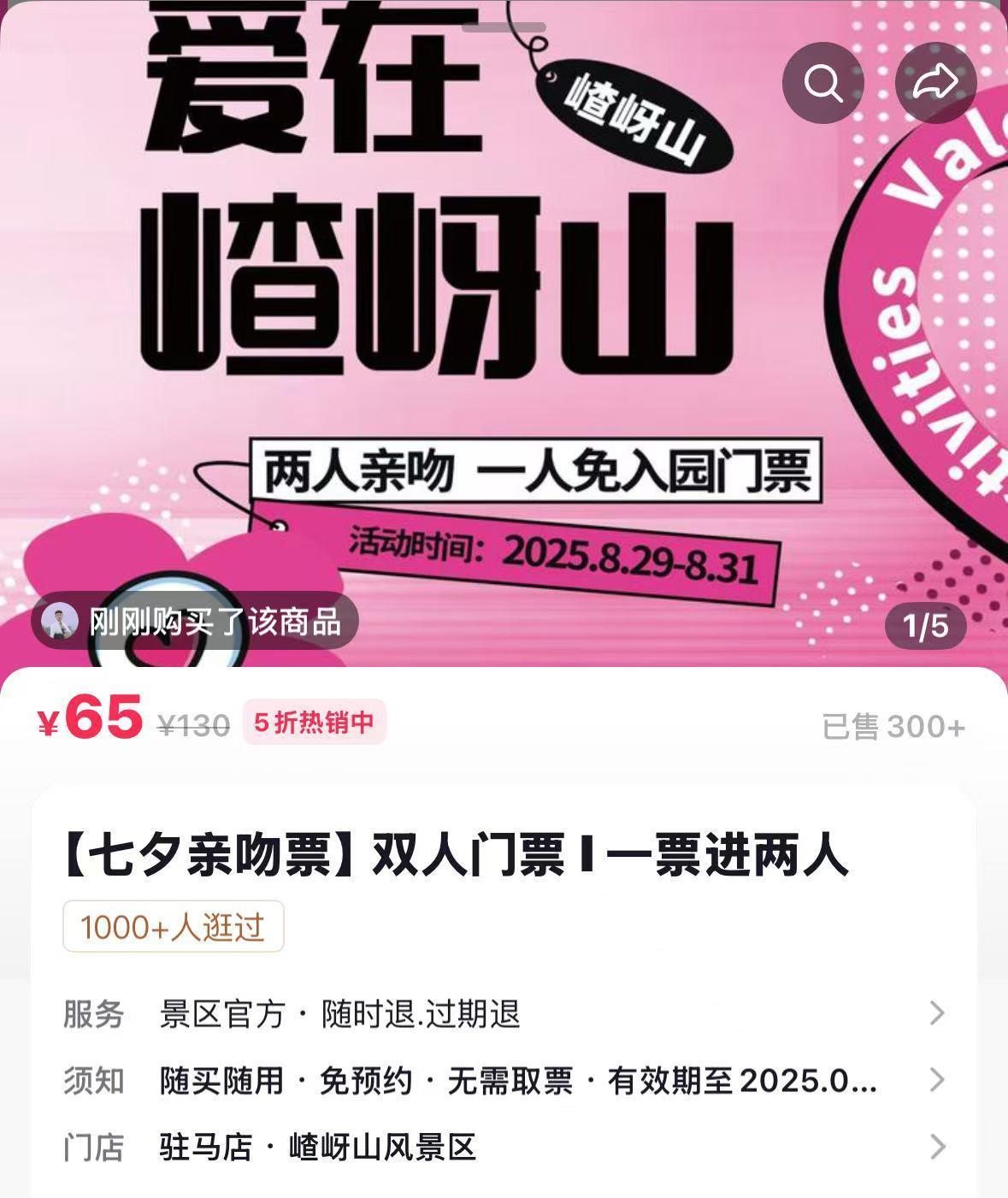 29日,極目新聞記者致電景區,工作人員回應稱,該活動為今年首次推出,旨在吸引更多游客前來游覽。活動期間,游客需先購買“七夕親吻票”(票價65元)方可參與“親吻免門票”優惠,本次活動不可與其他優惠措施同時使用。親吻行為須為嘴對嘴接觸,兩人在活動專屬打卡點親吻后即可享受一人免單。工作人員還補充,三人游覽不可拆分成兩兩組對,本次活動須以兩人為一組購票參與,每名游客僅可參與一次活動。