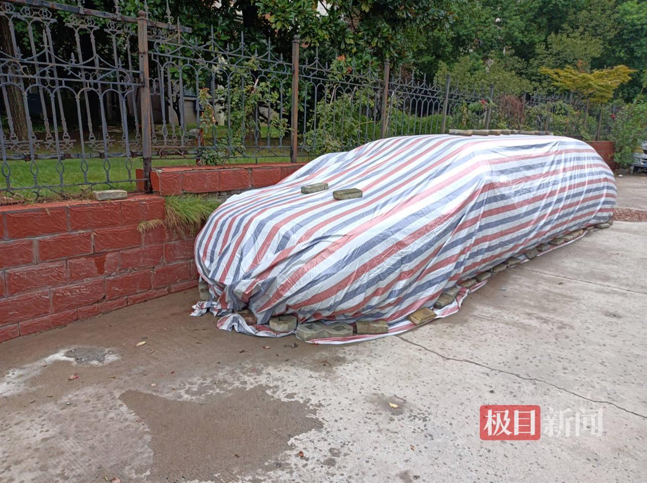 29日上午,極目新聞記者來到該車曾停放的路邊,經查看發現,這輛車原本停靠在生活垃圾房旁,現已不在原地。在停車場側面一條偏僻的小路上,記者找到了這輛車,它已經被防雨布包裹起來,防雨布四周還用磚塊壓住,以免被風吹跑。