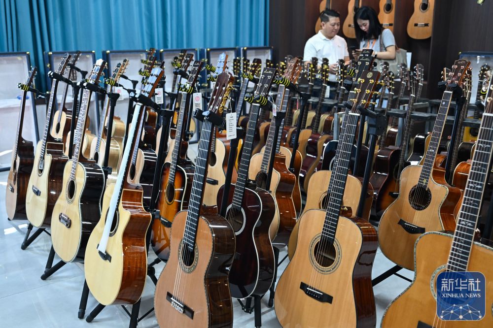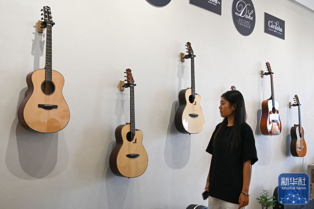 ↑ 8月28日,參觀者在湖北省松滋市一家吉他企業展廳參觀吉他成品。