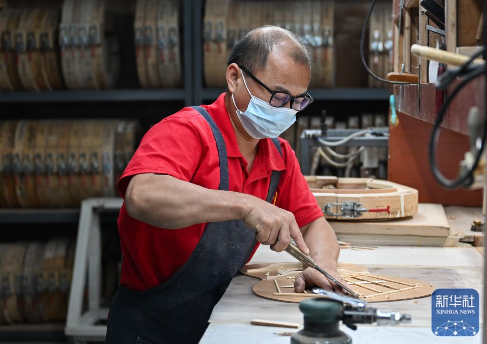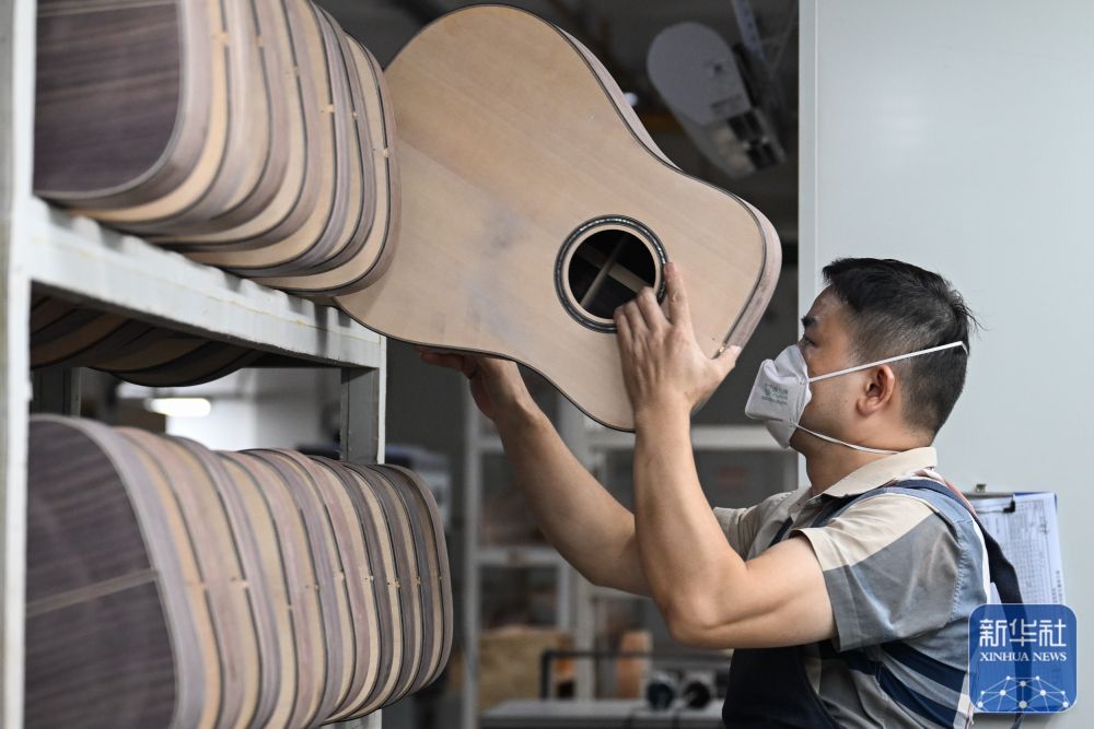 ↑ 8月28日,在湖北省松滋市一家吉他企業生產車間,工人在制作吉他。