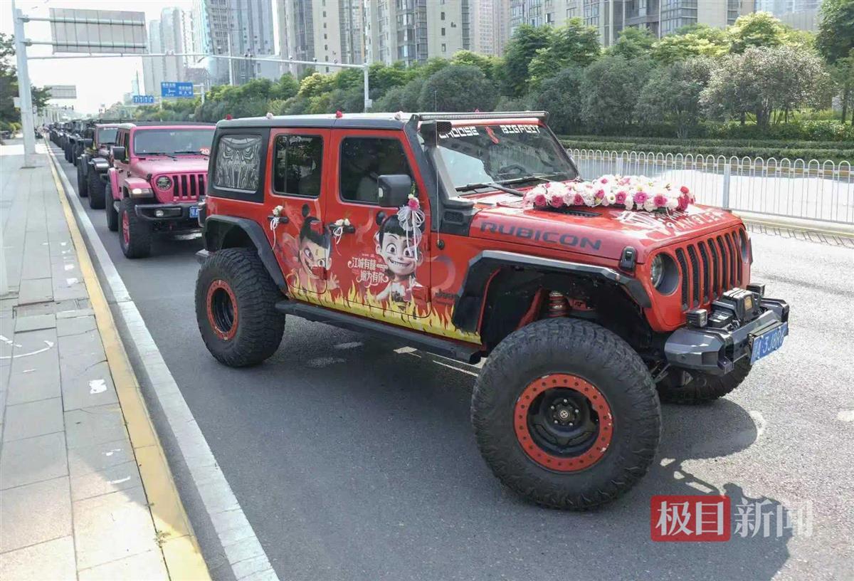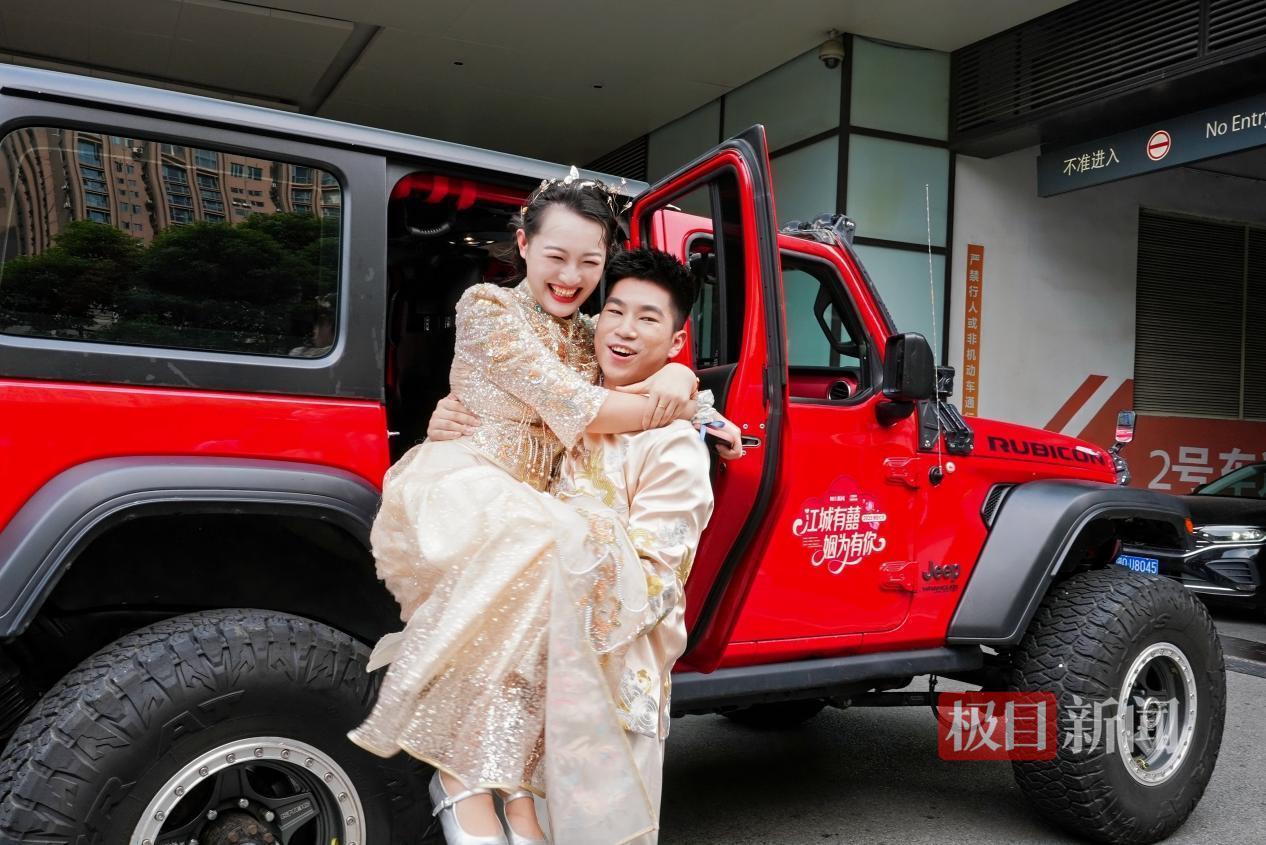 儀式過后,由Jeep牧馬人組成的婚車隊從璽合婚禮宴會中心出發,駛向黃浦路地鐵站。車隊穿行在武漢的大街小巷,車輛整齊列隊前行,車身張貼著統一的主題車貼,車頭點綴著喜慶花束,在陽光下格外醒目。新人們身著華服,紅妝映日、笑語隨風,引來市民紛紛駐足祝福,成為當日城市中一道流動的風景線。