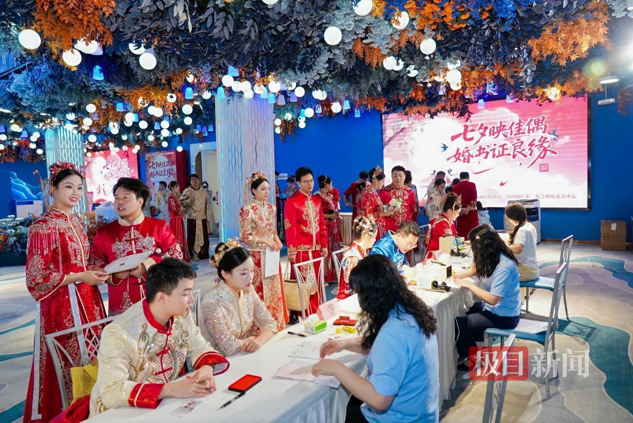 上午,新人們在璽合婚禮宴會中心完成傳統妝造后,前往青山區民政局七夕專設便民領證區,領取結婚證書。集體婚禮現場,主辦方領導發表致辭,祝愿新人們新婚快樂、百年好合。他表示,希望通過這場集體婚禮,讓更多人感受到愛情的美好,讓城市充滿溫暖。在鼓樂聲中,婚禮儀式依古禮進行,三拜成禮、合巹結緣,古老的婚俗與七夕的浪漫交織成一幅動人的畫卷。