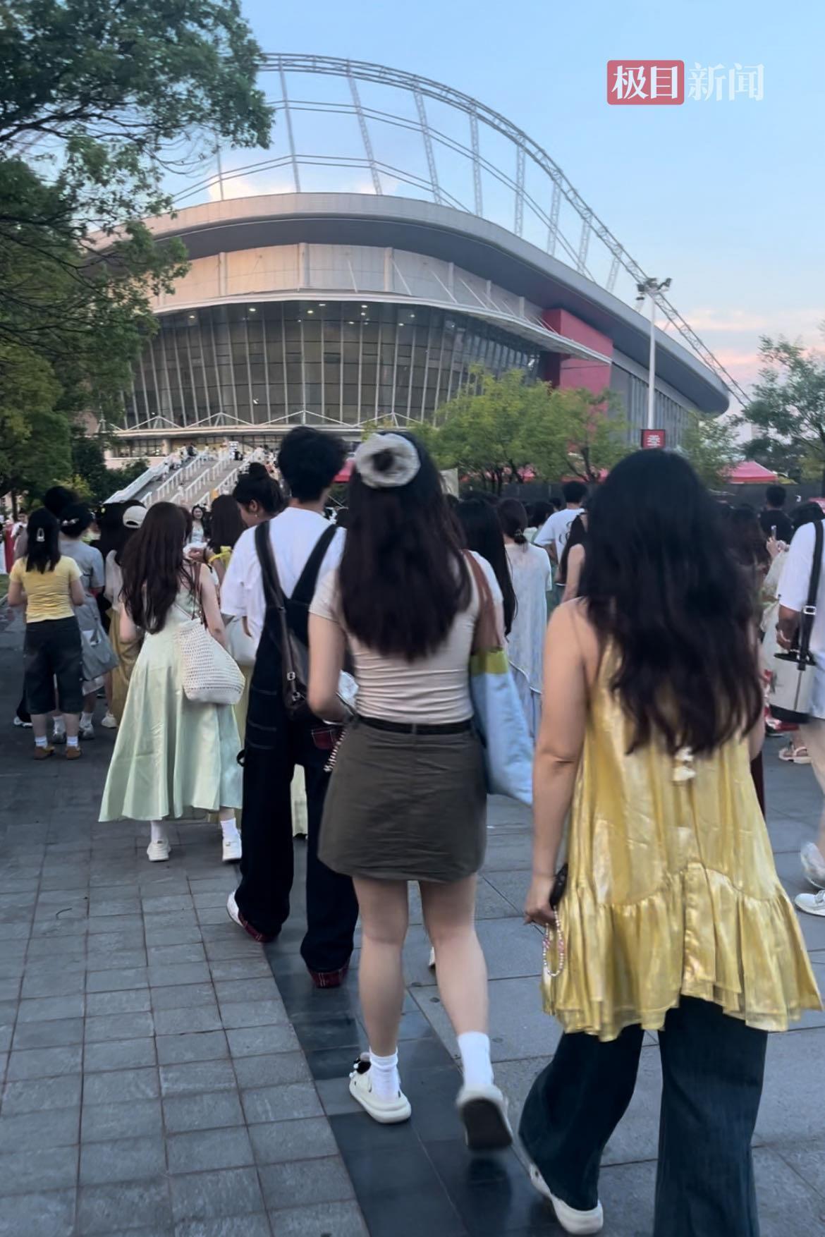 演唱會開始前,場館外一萬多名粉絲排隊入場,其中大部分是年輕人,有的粉絲穿著黃色的裙子,有的綁著黃色的發(fā)帶,有的拿著黃玫瑰,也有粉絲手里提著一個“南昌歡迎你”的禮袋。