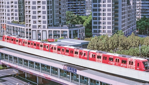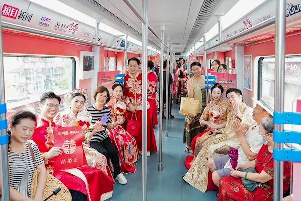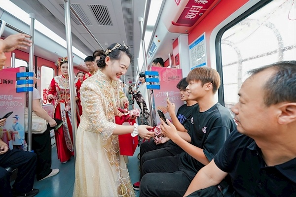 隨后,新人們登上地鐵1號線武漢首列“全景婚車”。大紅的“囍”字剪紙、喜慶的活動宣傳畫、靚麗的新人婚紗照,把車廂內外裝扮一新。列車啟動后,新人們笑靨如花,向乘客們分發喜糖,傳遞新婚的喜悅。“恭喜恭喜!”“新婚快樂!”乘客們欣喜地接過喜糖,并向新人連連道賀。