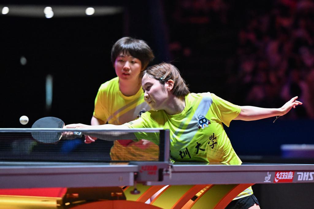 8月29日,深圳大學隊組合蒯曼(左)/平野美宇在比賽中。她們在雙打比賽中3比1戰勝成都高新若水居隊組合冷雨桐/張本美和。新華社記者 丁磊 攝