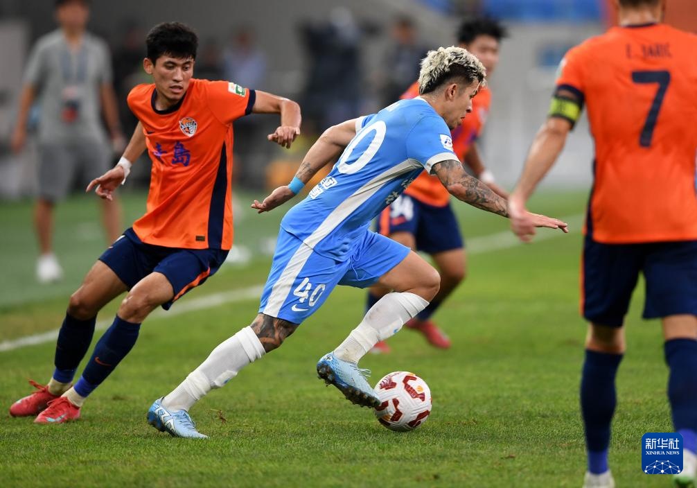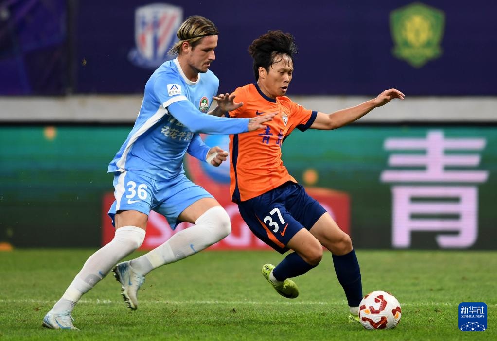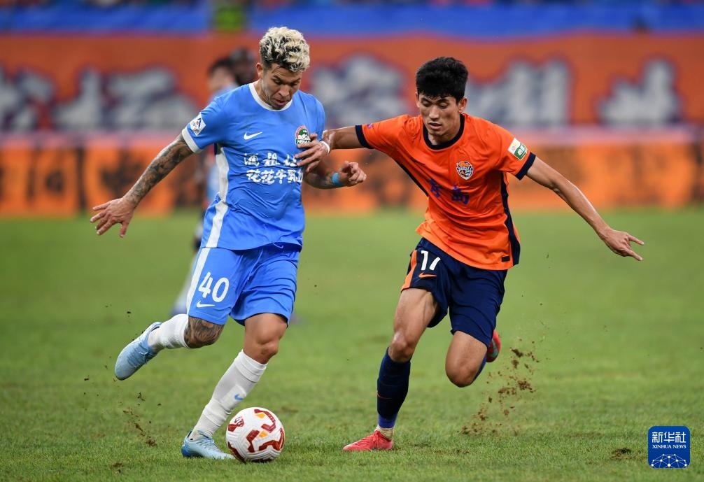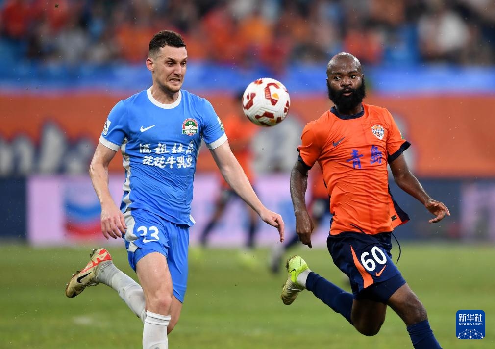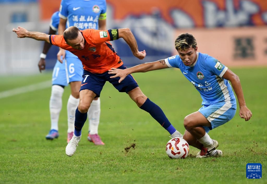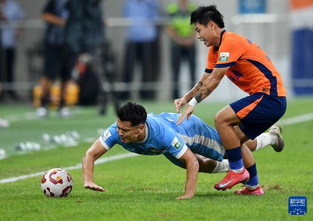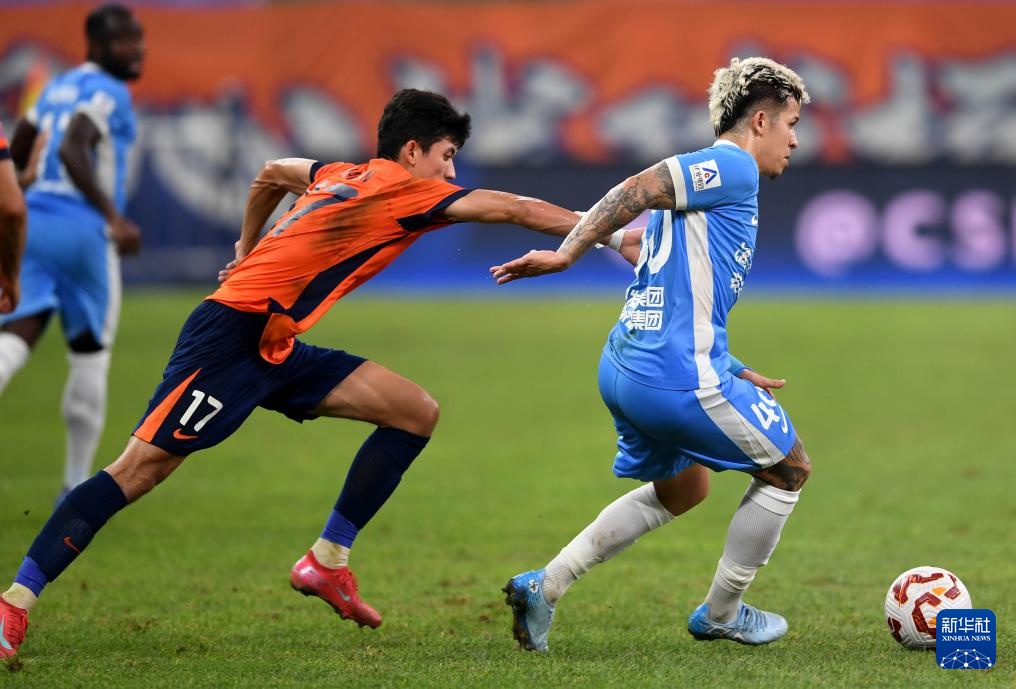 8月29日,青島海牛隊球員蘭克爾澤(右)在比賽中防守河南俱樂部酒祖杜康隊球員盧卡斯·馬亞。