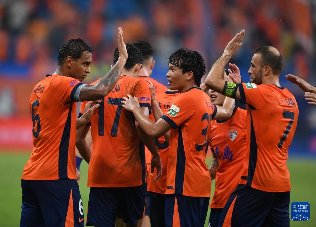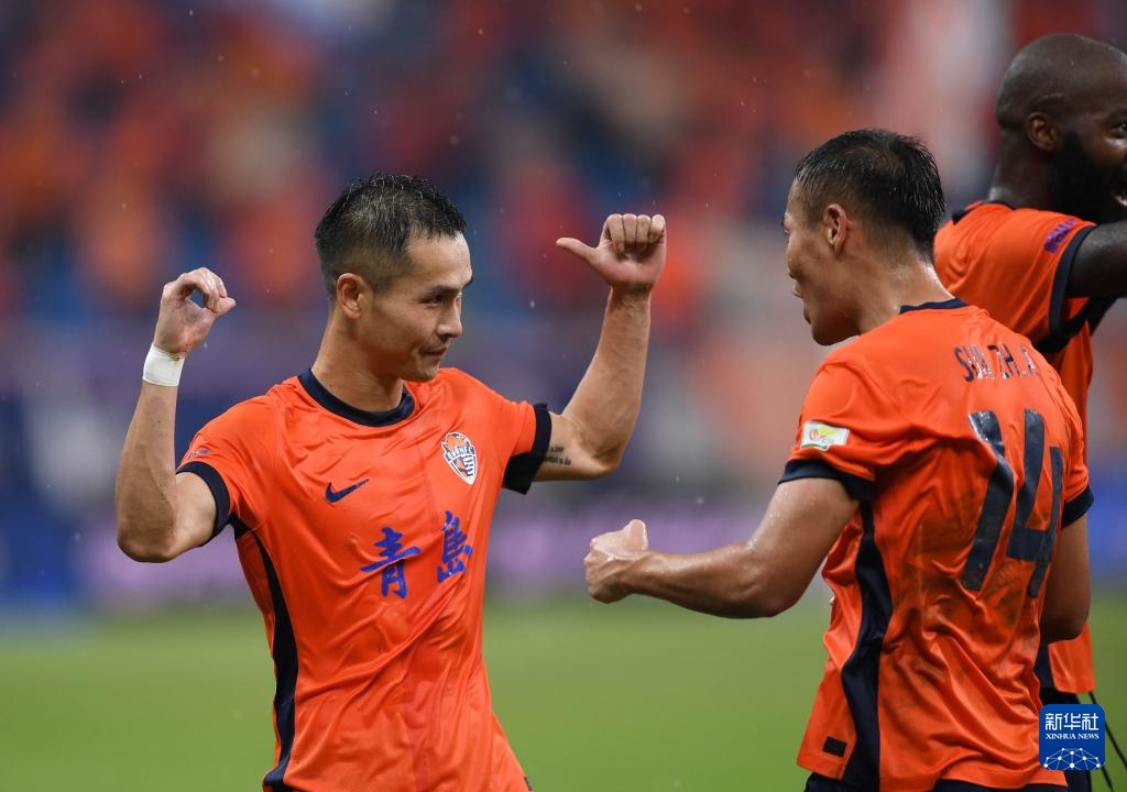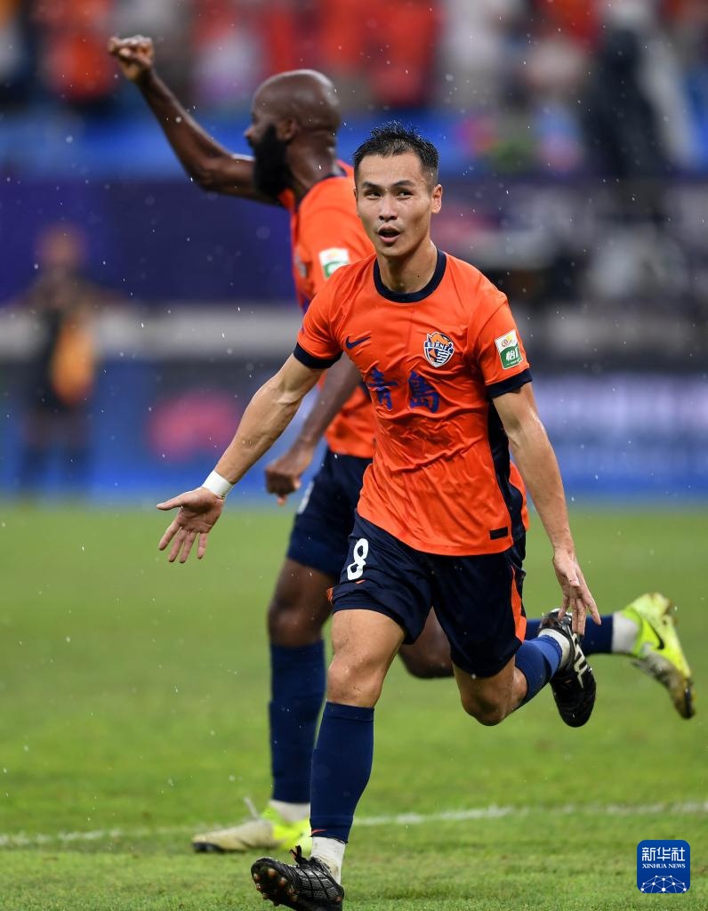 8月29日,青島海牛隊球員在比賽中慶祝進球。
