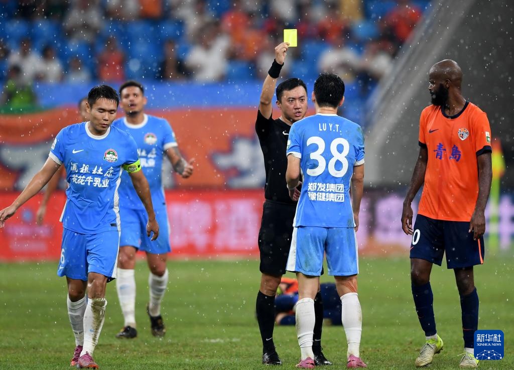 8月29日,本場比賽主裁判唐順齊(中)在比賽中向河南俱樂部酒祖杜康隊球員盧永濤(右二)出示黃牌。