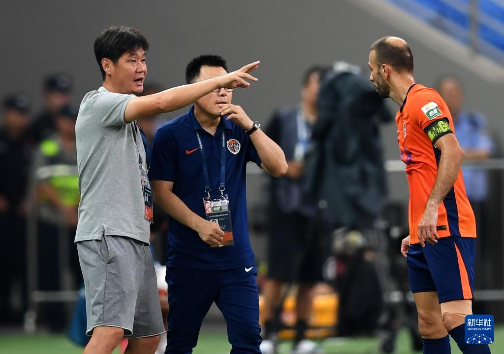 8月29日,青島海牛隊主教練李霄鵬(左)在比賽中指導球員薩里奇(右)。