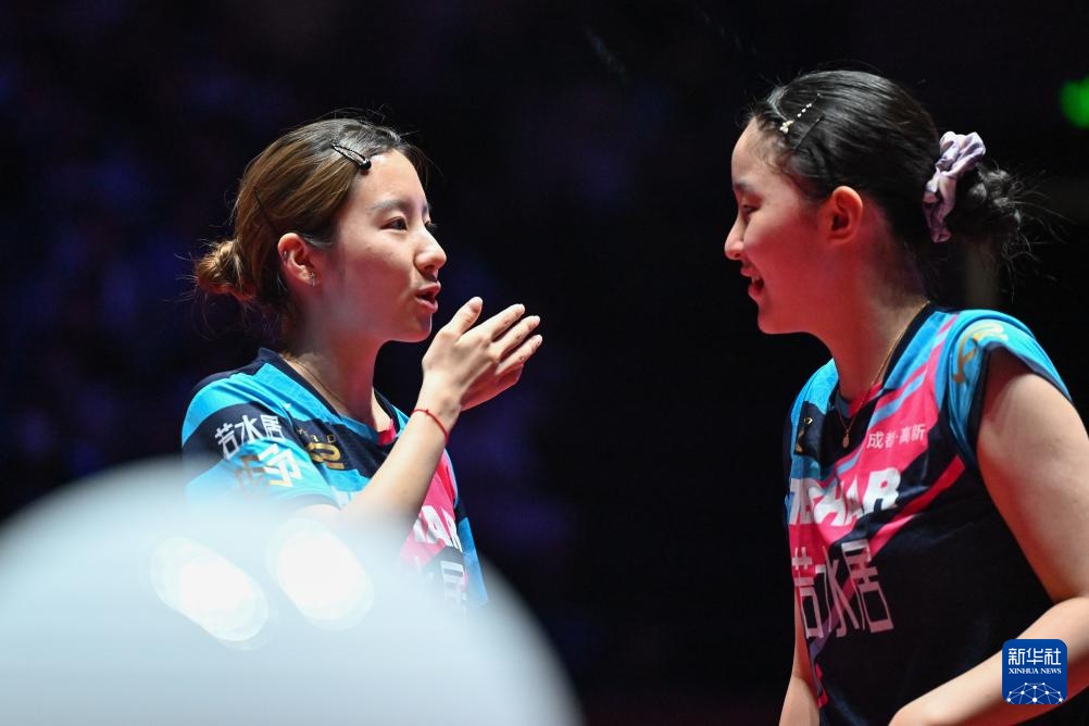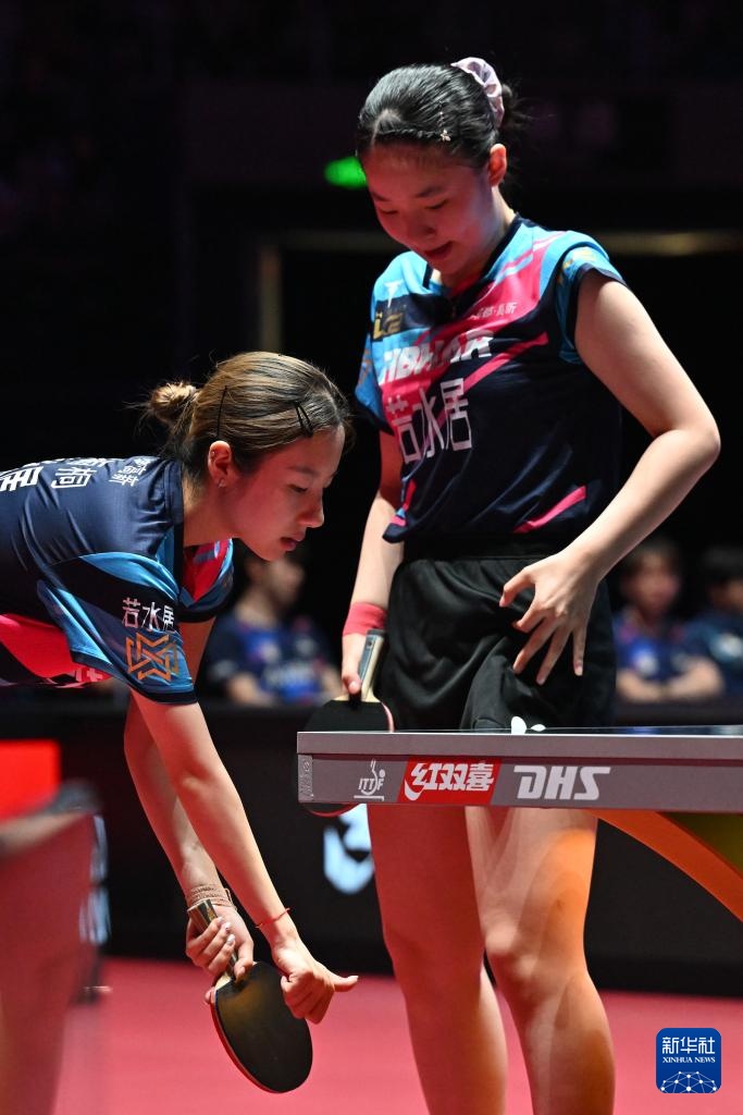 8月29日,成都高新若水居隊組合冷雨桐/張本美和(右)在比賽中交流。她們在雙打比賽中1比3不敵深圳大學隊組合蒯曼/平野美宇。