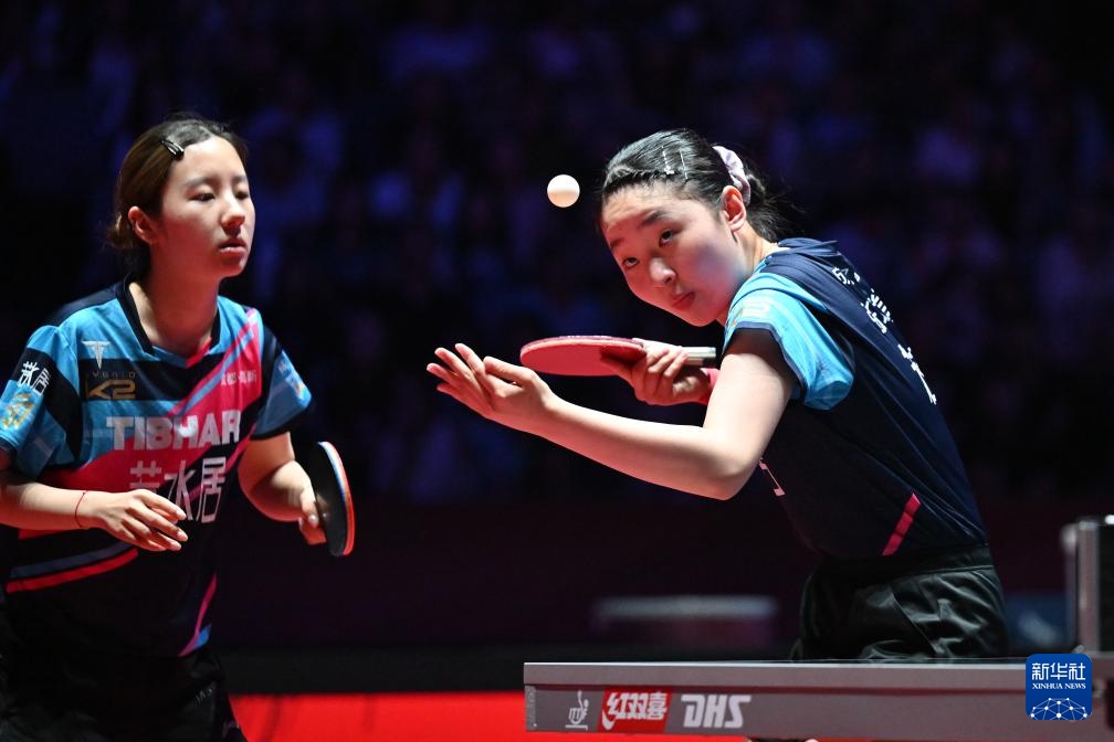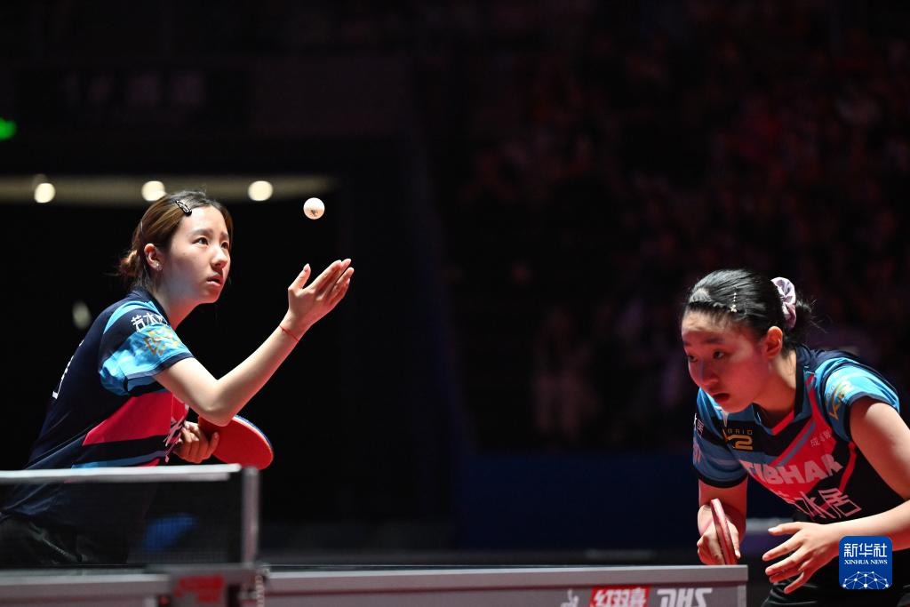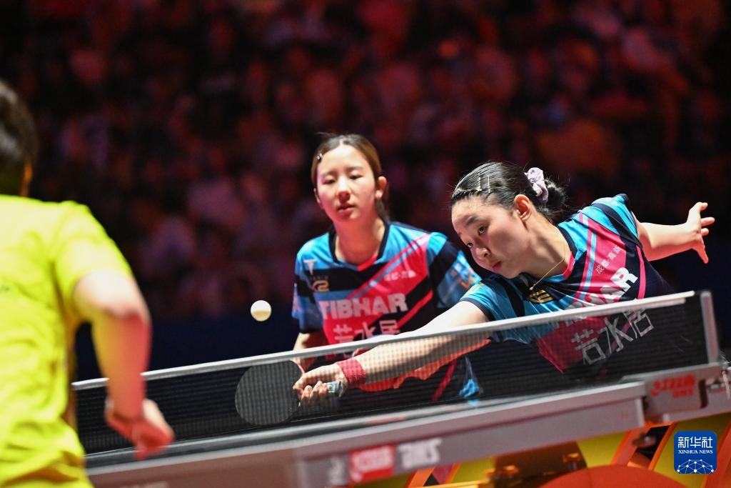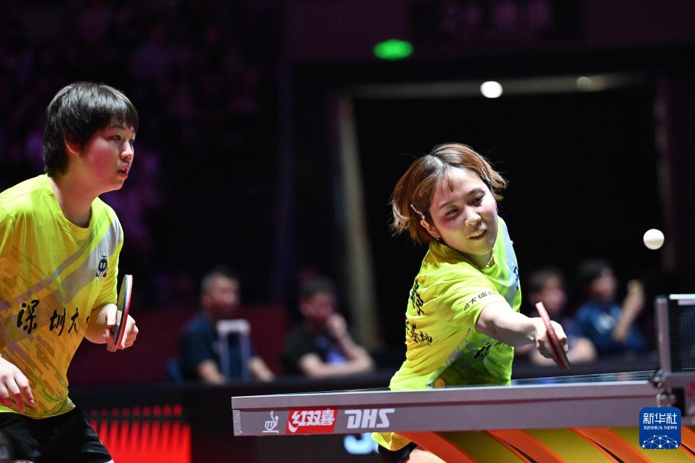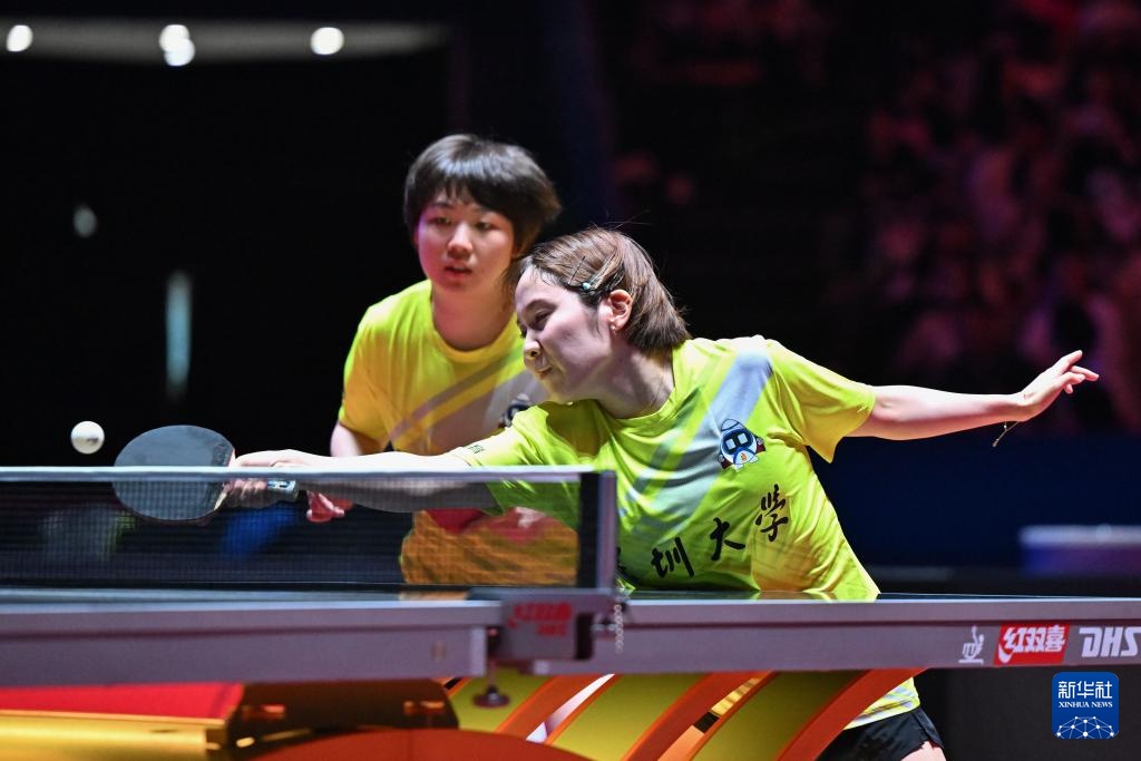 8月29日,深圳大學隊組合蒯曼(左)/平野美宇在比賽中。她們在雙打比賽中3比1戰勝成都高新若水居隊組合冷雨桐/張本美和。