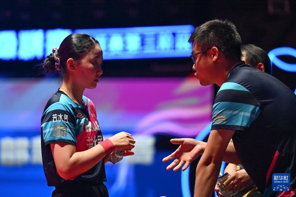 8月29日,成都高新若水居隊選手張本美和(左)在比賽間隙和教練交流。她在單打比賽中2比3不敵深圳大學隊選手蒯曼。