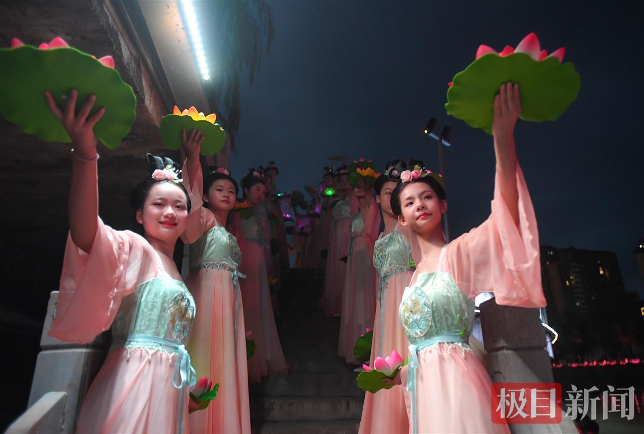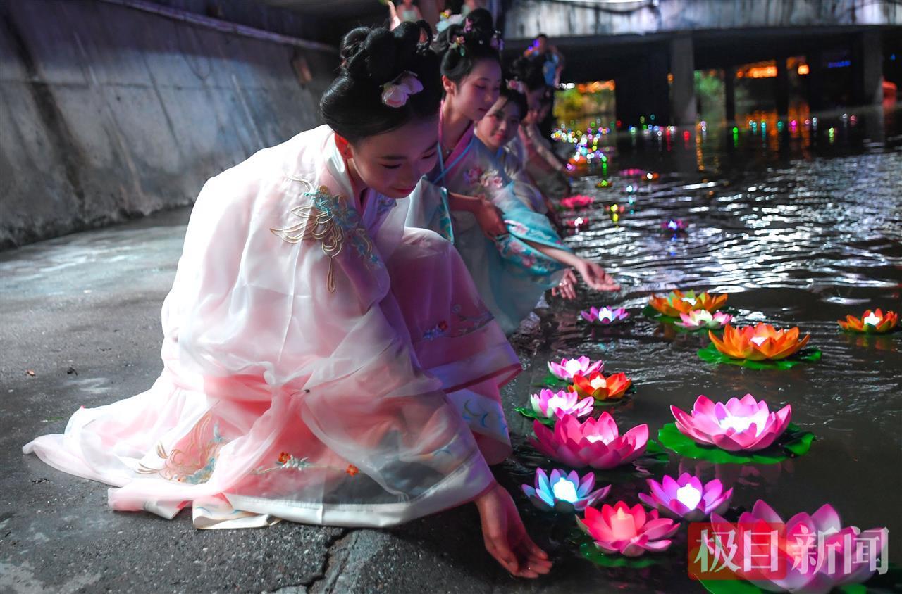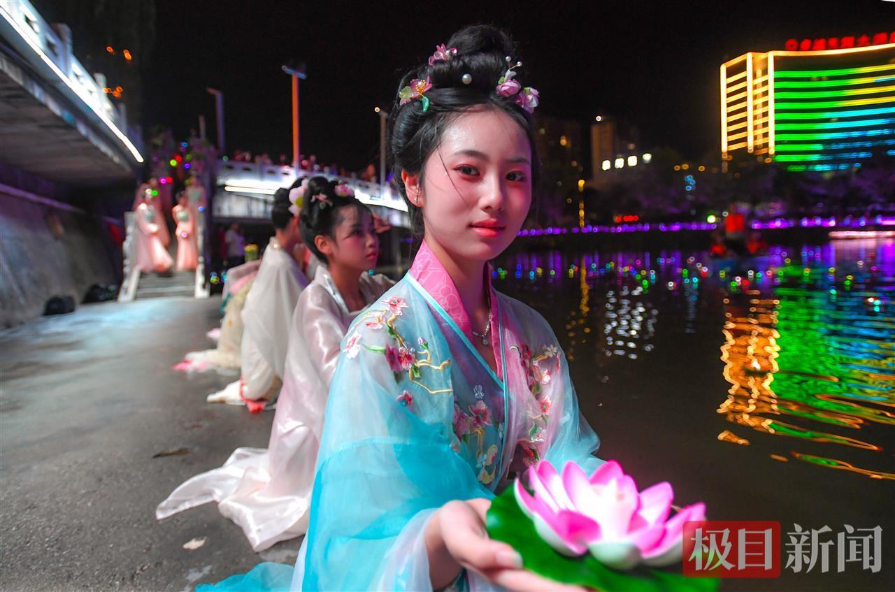 銀漢迢迢夜未央,河燈點點泛星芒。8月29日傍晚,湖北省十堰市鄖西縣天河之畔,晚風輕拂,水波瀲滟。在鄖安橋邊,一場延續千年傳統的七夕河燈祈愿儀式緩緩拉開帷幕。27位身著漢服、宛如仙子的舞者在樂聲中翩翩起舞,與緩緩漂流的蓮花河燈交相輝映,仿佛為牛郎織女的鵲橋相會指引方向,也為這場“中國七夕文化之鄉”的年度盛典畫上濃墨重彩的一筆。