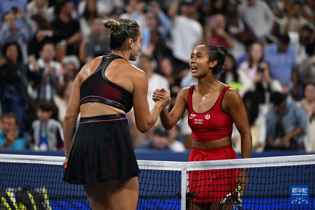 8月29日,薩巴倫卡(左)和萊拉·費爾南德斯在比賽后握手致意。