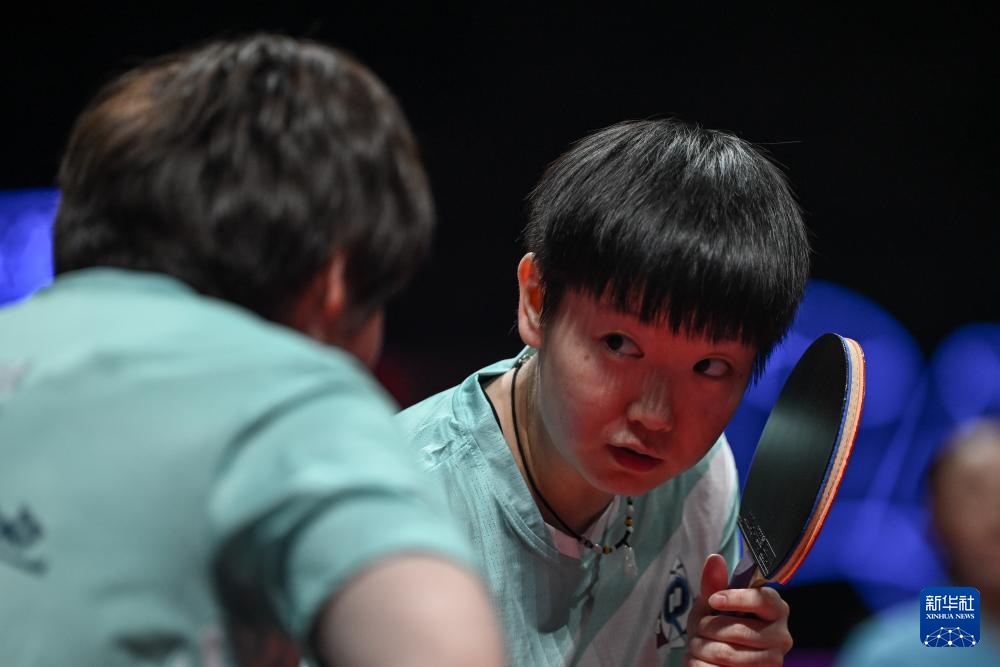 8月30日,深圳大學隊組合孫穎莎(右)/蒯曼在比賽中討論戰術。她們在雙打比賽中3比1戰勝黃石華新隊組合韓菲兒/申裕斌。