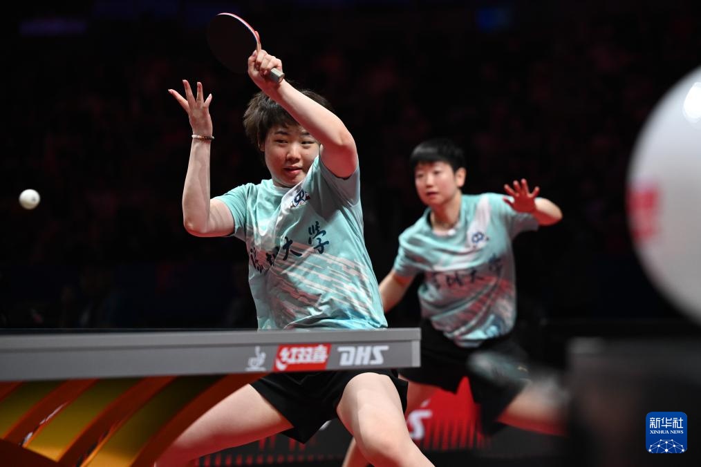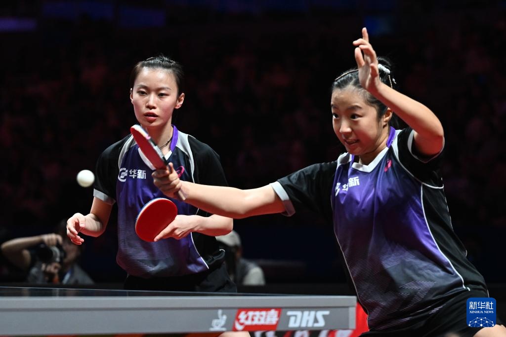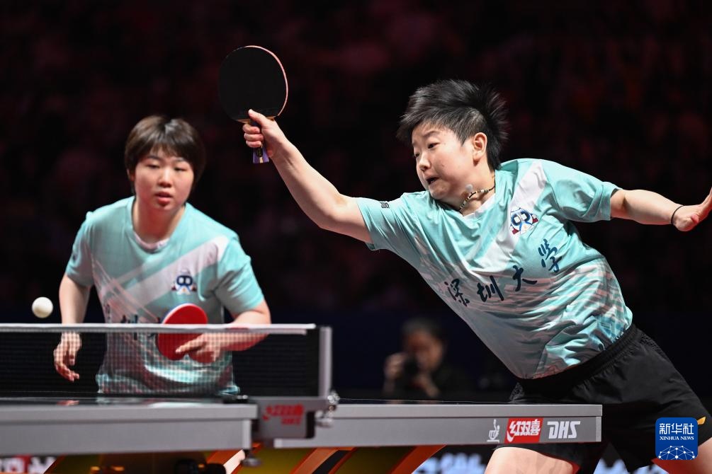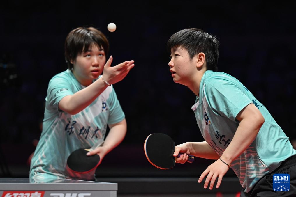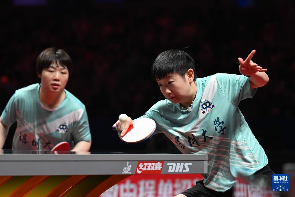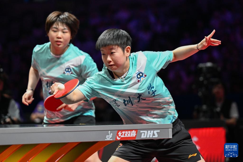 8月30日,深圳大學隊組合孫穎莎/蒯曼(左)在比賽中。她們在雙打比賽中3比1戰勝黃石華新隊組合韓菲兒/申裕斌。