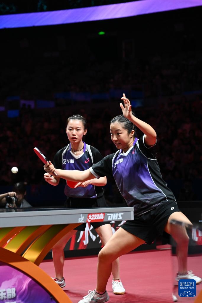 8月30日,深圳大學隊組合孫穎莎/蒯曼(前)在比賽中。她們在雙打比賽中3比1戰勝黃石華新隊組合韓菲兒/申裕斌。