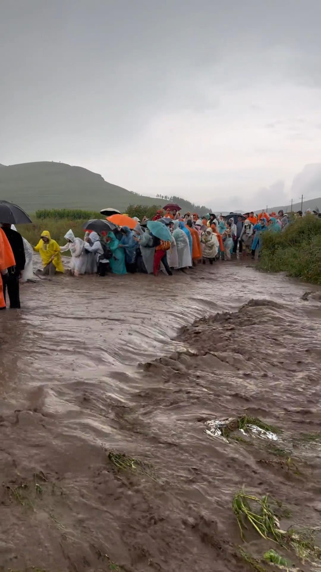 視頻畫面顯示,有游客身穿雨衣準備搭乘當地村民的拖拉機過路,還有不少游客手拉著手抱團通過排水渠,但隨著雨勢變大,排水渠內水流也逐漸變得湍急,有游客拄著登山杖通行時差點摔倒。
