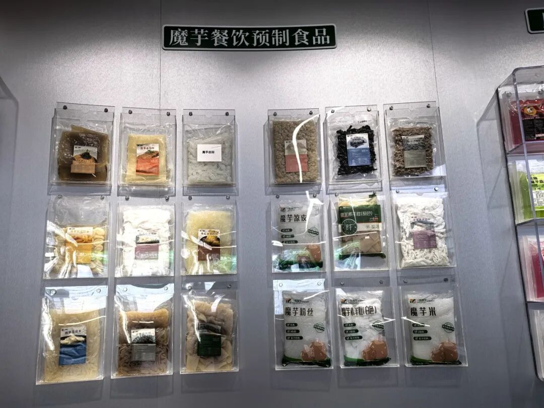 墻上陳列著琳瑯滿目的魔芋產(chǎn)品:各類魔芋親水膠體、休閑零食、食品及茶飲小料,甚至寵物罐頭材料等琳瑯滿目……不僅如此,魔芋還憑借其高分子材料的特性,拓展出美妝洗護(hù)等多類衍生品。