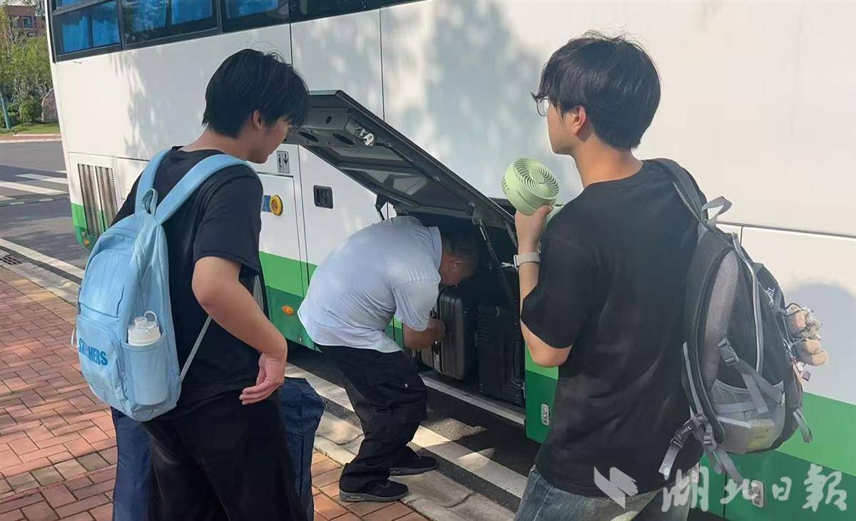 在地鐵7號線江夏客廳站定制公交接駁點,大學生們提著行李有序排隊上車,公交司機張磊、余剛等則主動上前,分工協作,一人拉開行李艙蓋,幫忙將行李箱放到專屬位置,一人則熱情引導學生進入車廂,一一就座。大一新生王志勇在感受公交司機的服務熱情后連聲道謝:“我家在外地,今年是第一次坐高鐵到武漢,路線不熟還帶這么大的行李箱,確實不方便,沒想到,一出地鐵就能坐上直達學校的定制公交,真的太貼心了!”