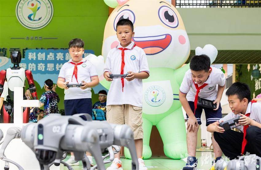 9月1日,武漢市光谷第二十一小學,同學們操作機器狗進行表演。