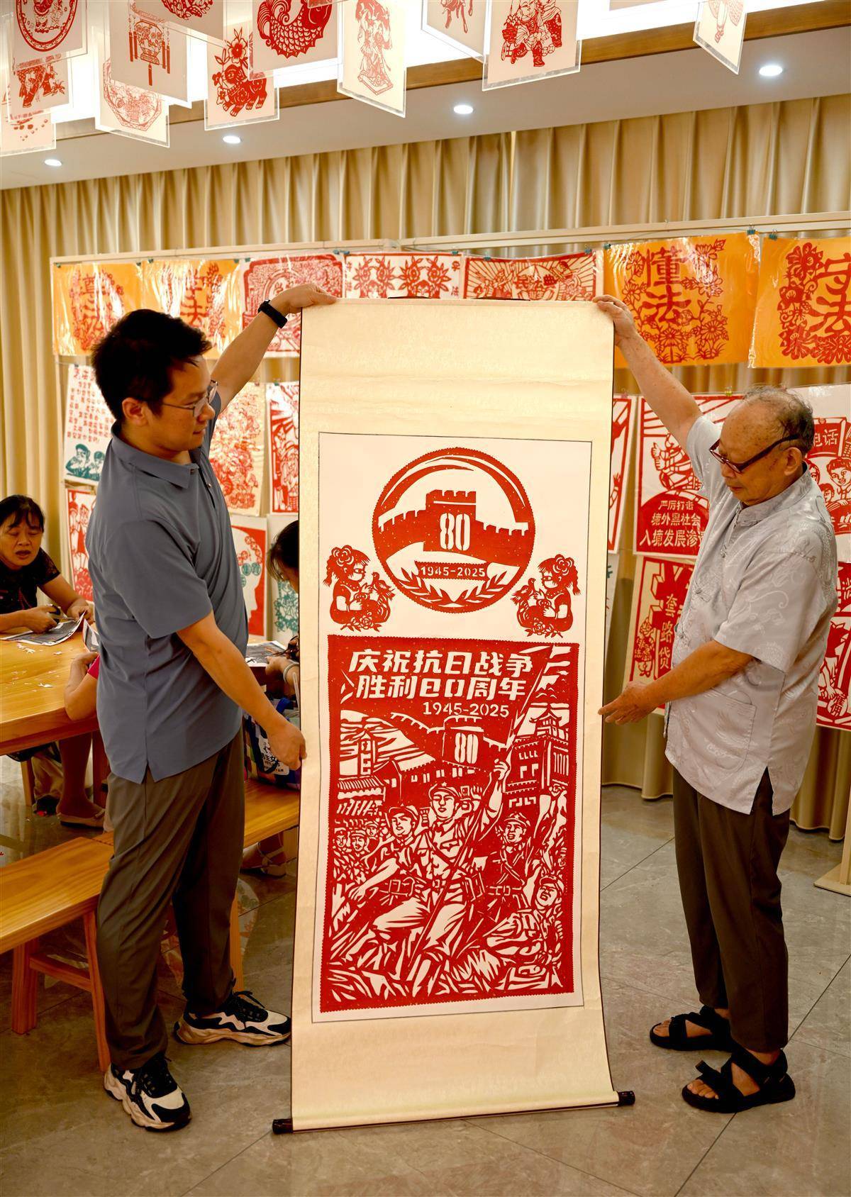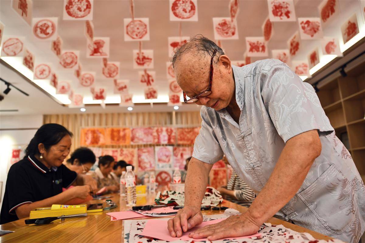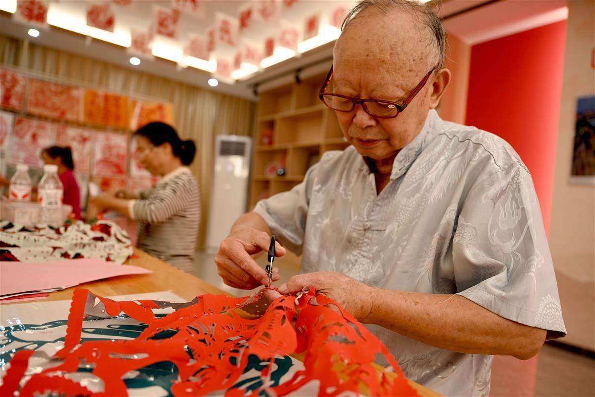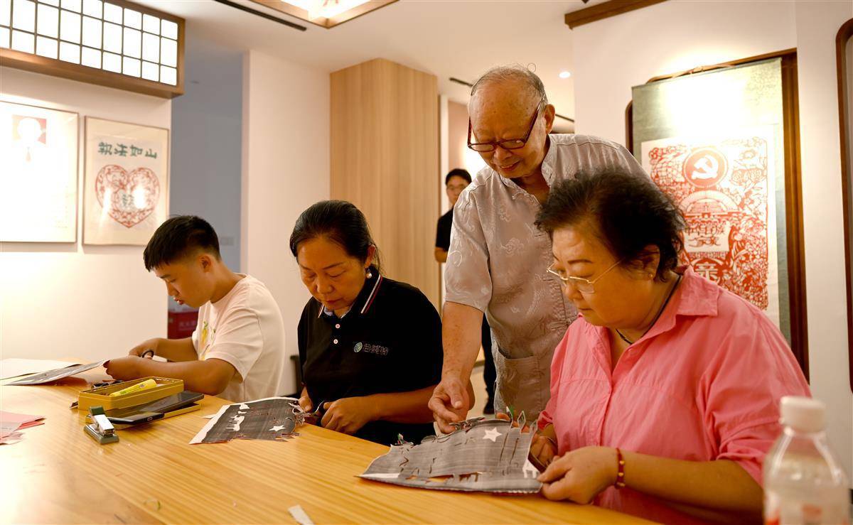 9月1日,在宜都市陸城街道錦江社區活動室里,76歲的退伍老兵、剪紙藝人艾道新正耐心地向居民傳授剪紙技藝。只見他手中紅紙輕轉,剪刀穿梭,不一會兒,一個個英氣勃勃的抗戰人物形象與象征和平的白鴿便躍然紙上。精湛的技藝引得在場居民贊嘆不已,大家不僅現場體驗到了非遺剪紙的獨特魅力,也接受了一次生動的愛國主義教育。