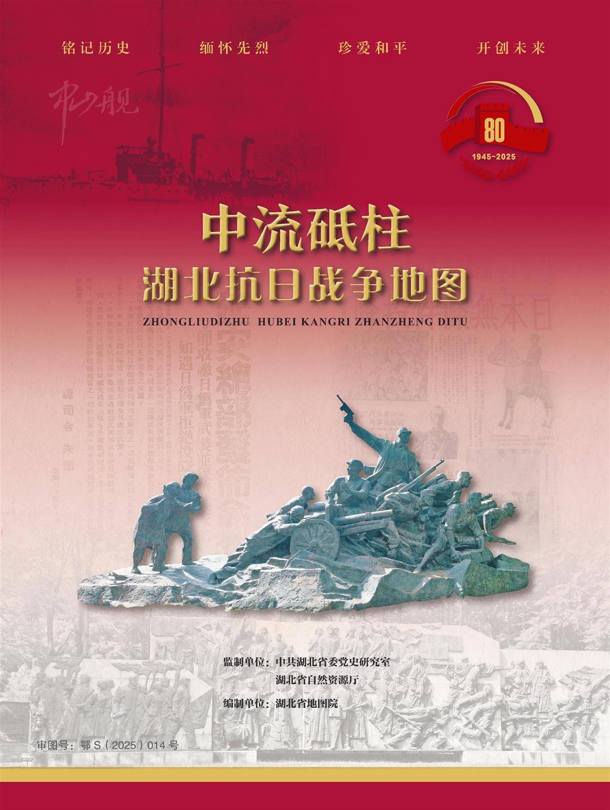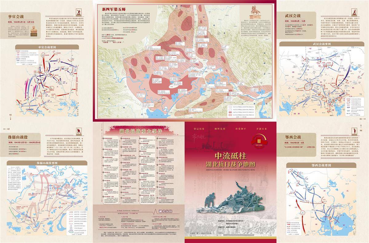 近日,中共湖北省委黨史研究室和省自然資源廳聯合監制,省地圖院編制的《中流砥柱——湖北抗日戰爭地圖》正式與讀者見面。該地圖正面為湖北抗戰大事記,并用地圖的形式表現了在湖北發生的武漢會戰、棗宜會戰、侏儒山戰役、鄂西會戰等重大戰役,在地圖上追憶了由中國共產黨領導的新四軍第五師在湖北的抗戰足跡。地圖反面為在湖北省地圖上標注了國家級抗戰紀念設施遺址、國家級和省級重要抗戰文物保護單位和湖北籍以及犧牲在湖北的著名抗日英烈。