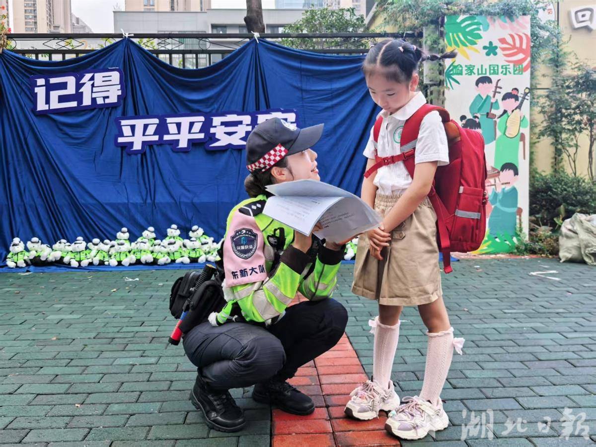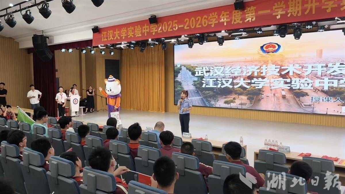 經開區(qū)民警錢春俐在江漢大學實驗中學開學典禮上,為全體學生講授“交通安全第一課”。東湖風景區(qū)交通大隊民警走進新磨山社區(qū)銀河貝貝幼兒園,通過生動講解與互動,為小朋友們普及基礎交通知識。