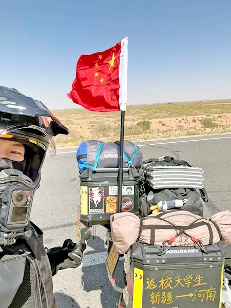 8月26日,他從新疆克拉瑪依的家里出發返校,全程約3500公里,一路上主要在野外住帳篷,天氣不好的時候住旅館、酒店,目前總共只花了1000多元,主要是給摩托車加油。9月1日,他已到內蒙古包頭市,行程已過半,預計可以趕上9月5日、6日學校的開學時間。