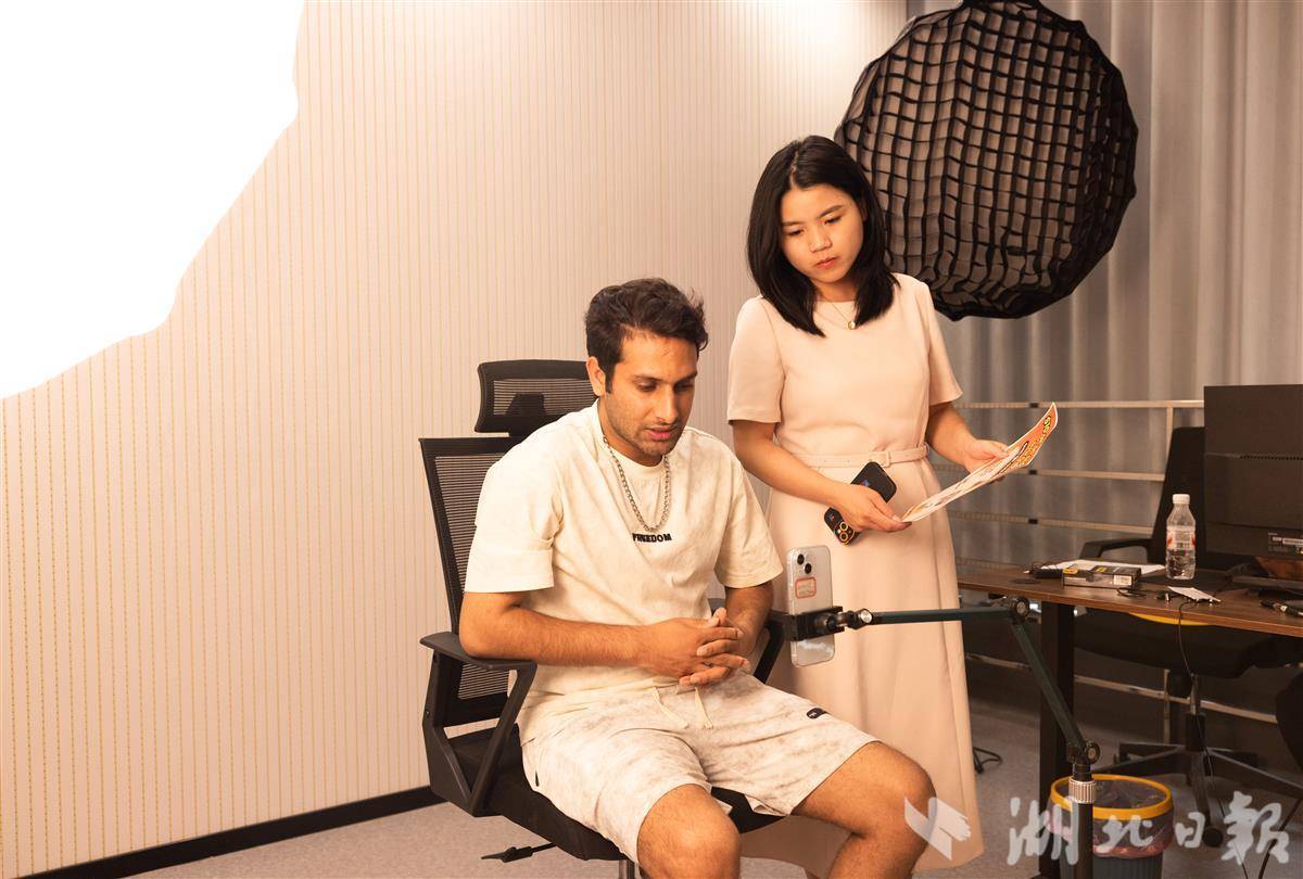 畢微現(xiàn)場(chǎng)指導(dǎo)外籍主播直播。(湖北日?qǐng)?bào)全媒記者 薛婷 攝)