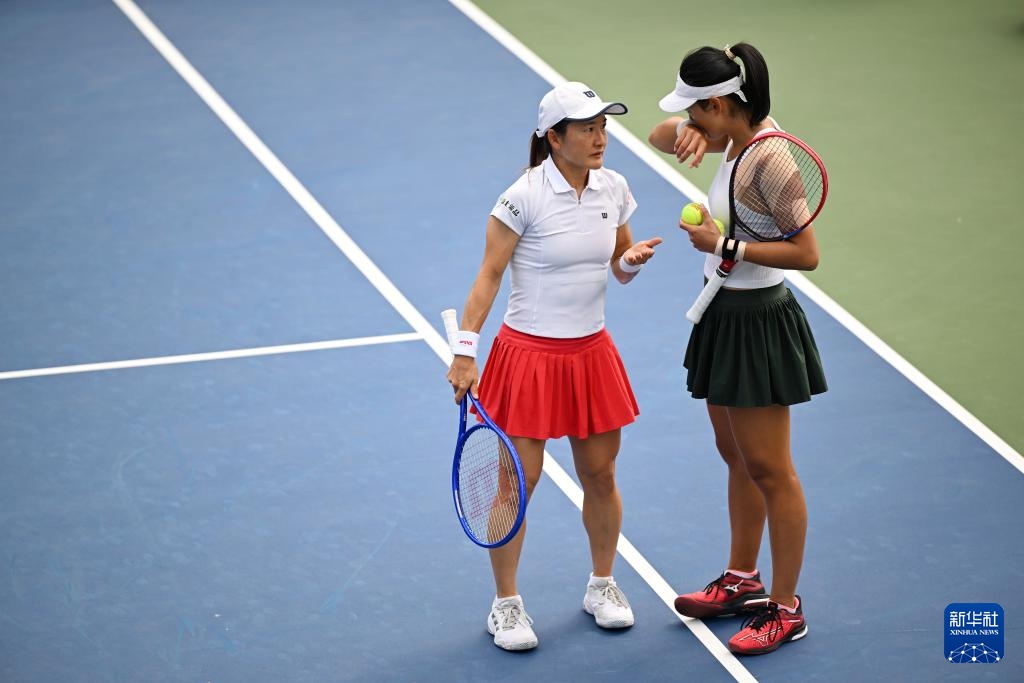 9月1日,安德烈耶娃(左)/施奈德在比賽中商討戰術。