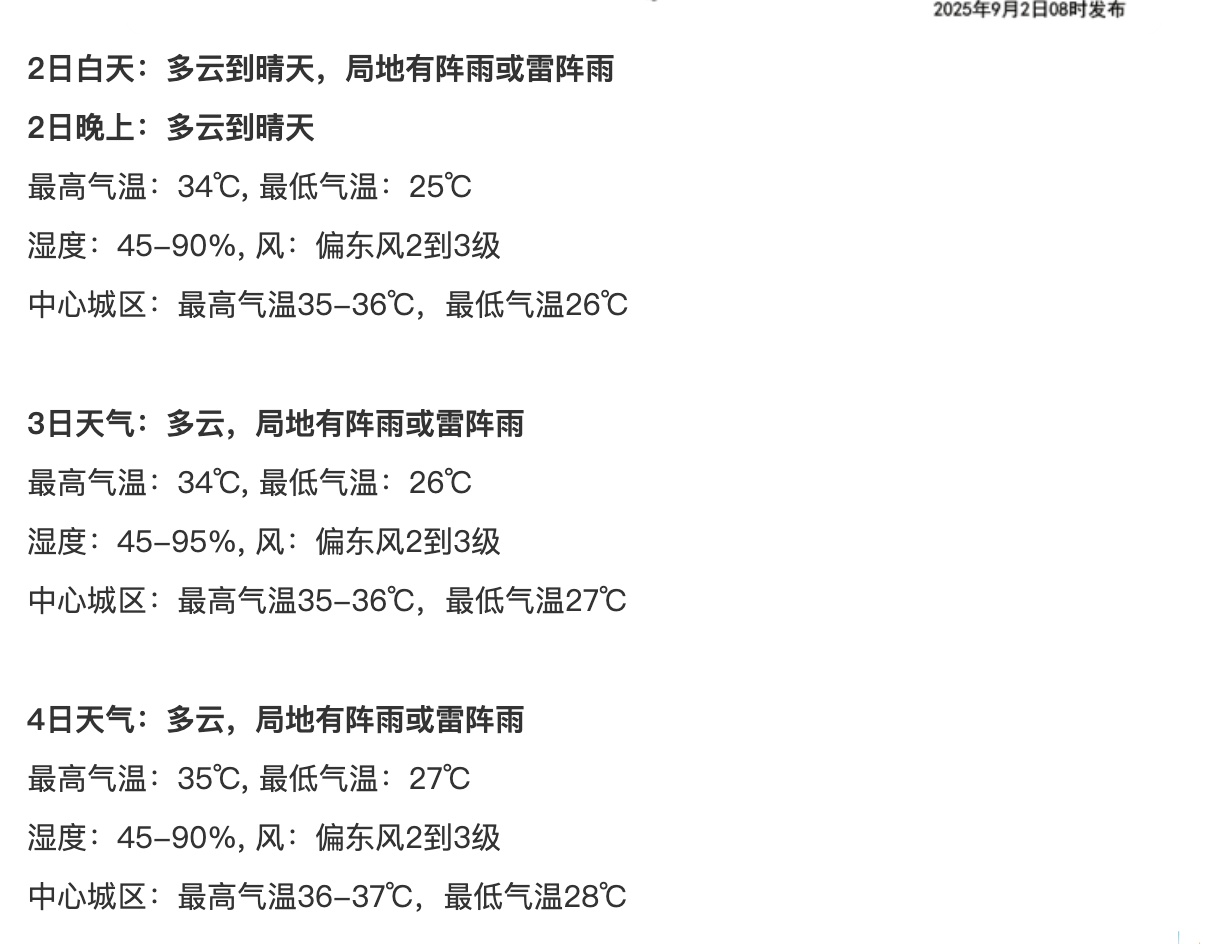 湖北日報訊(記者湯煒瑋、實習生任康中、通訊員陳聲超)9月2日,武漢市早晨晴天到多云,最低氣溫大部24~27℃,中午氣溫逐漸上升到35℃左右。