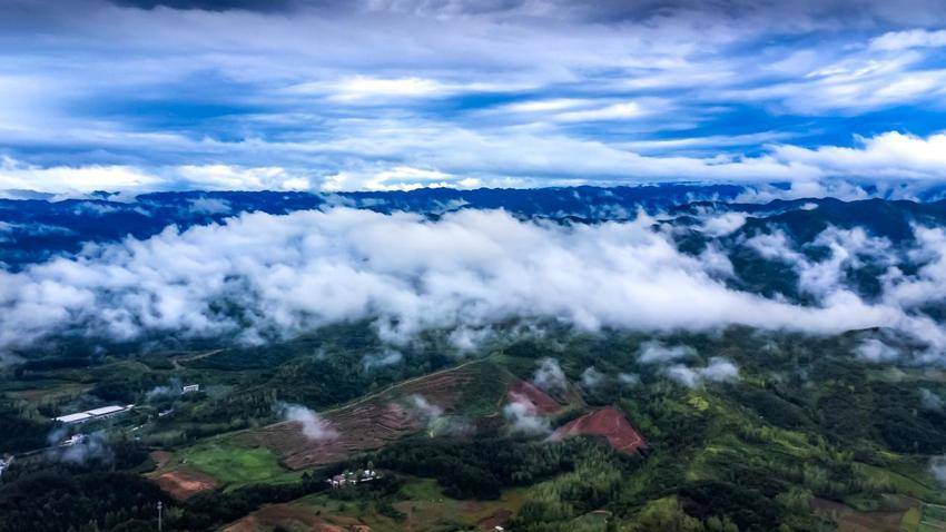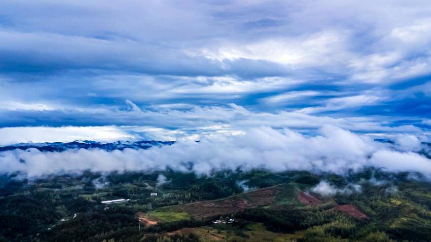 云霧貼著地面緩緩流動(dòng),像是大地呼出的氣息。山間草木掛滿了晶瑩的水珠,宛如鑲嵌著無(wú)數(shù)顆璀璨的寶石。一陣夾雜著水汽的山風(fēng)吹過(guò),云霧瞬間被吹散,露出了青山的真面目,眼前豁然開(kāi)朗,讓人驚嘆大自然的神奇。