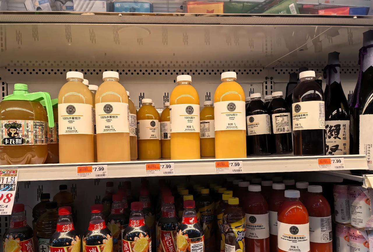 圖片顯示,胖東來果汁在美國超市售價為7.99美元(約合57元人民幣)一瓶,每瓶容量1L,有葡萄、芒果、水蜜桃三種口味。該網友表示,自己是在亞克拉拉一家大華連鎖超市購買的,價格在同類產品中偏高,或許是附加了運輸成本和稅費。