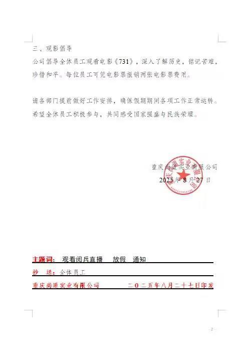 發(fā)通知的是重慶尚道實(shí)業(yè)有限公司,文件是8月27日下發(fā)的。通知說(shuō),辦公室人員統(tǒng)一在會(huì)議室集中收看,非辦公室人員可根據(jù)實(shí)際情況自行安排觀看。此外,通知還提到,公司倡導(dǎo)全體員工觀看電影《731》,每位員工可憑電影票報(bào)銷(xiāo)兩張電影票費(fèi)用。