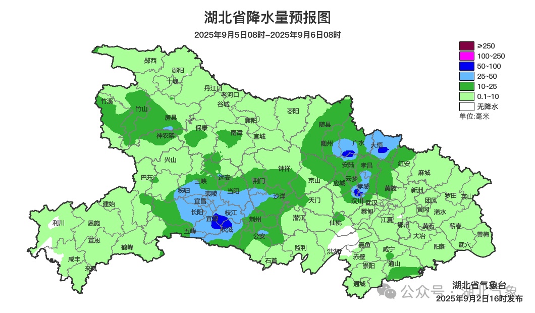 9月5日8時至6日8時,鄂西北、鄂西南、江漢平原、鄂東北西部多云有分散性陣雨或雷陣雨,局地大雨或暴雨;其他地區晴天到多云,局地有陣雨或雷陣雨。最高氣溫鄂西北西部27~30℃、其他地區33~38℃,最低氣溫鄂西北19~23℃、其他地區23~27℃。偏東風2到3級轉偏北風3級、陣風4到6級。