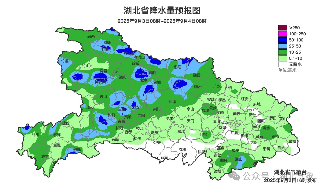 9月3日8時至4日8時,鄂西北、鄂西南、江漢平原、鄂東北西部多云有分散性陣雨或雷陣雨,局地大雨或暴雨;其他地區多云到晴天,局地有陣雨或雷陣雨。最高氣溫鄂西北25~30℃、其他地區31~36℃,最低氣溫22~27℃。偏東風2到3級。