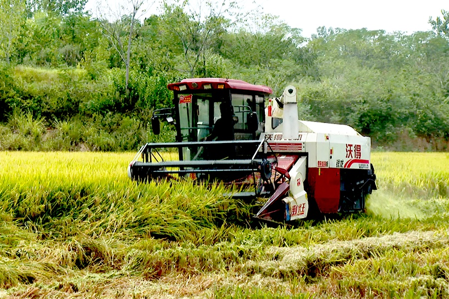 在汪崗鎮汪家崗社區的40畝稻田里,大型聯合收割機正轟鳴著來回穿梭,金色的稻穗被卷入機身,眨眼間便脫粒歸倉,現場呈現出一幅生動的豐收畫卷。很難讓人想象,這片生機勃勃的稻田在去年還是一片荒地,此前為配合鎮區建設,這里曾作為土源供應地,土方開挖后,整個地面變得高低不平,坑洼遍布。